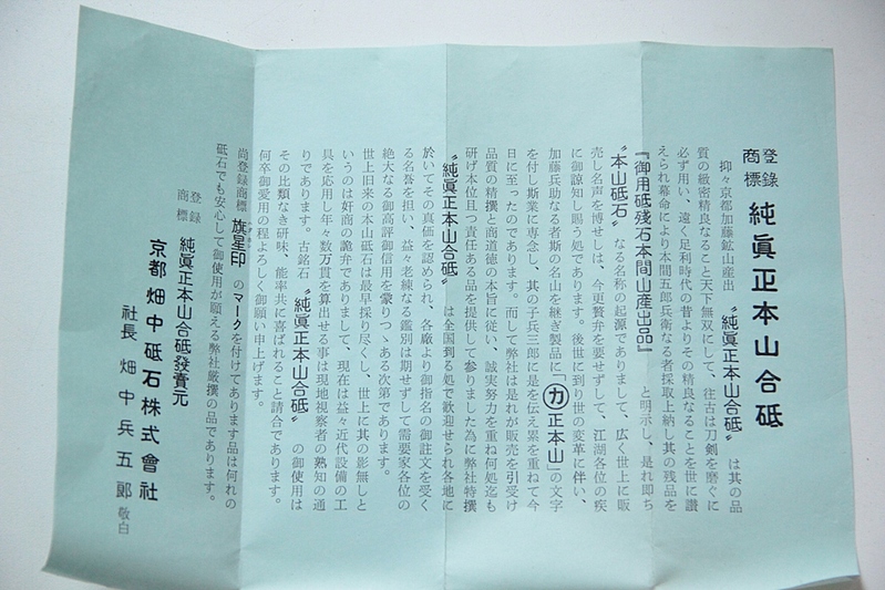 Быстро работает.Поверхность гладкая и шелковистая на ощупь. Особенно эффективен при использовании Асано нагура. Суспензия от нагура не смешивается с зерном от самого камня. Суспензия молочного цвета. Выдаёт очень хороший результат. Родная коробочка в очень хорошем сохране. Породистый, очень приличный камень для истинных ценителей.