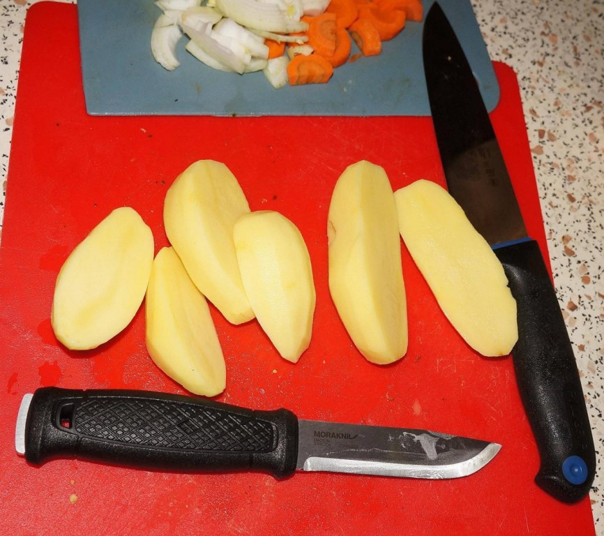 Re: Наши ножиВикториноксы кухонные просто прелесть, даже те с цветными ручками, 10-12 см, что по 250 руб. (артикул: 6.7706). Но мора вообще как бы не для кухни, толстое лезвие, спуски не от обуха, это землю рыть, деревья рубить (зачем то), в общем в аутдоре заниматься всякой фигней, бушкрафтить.