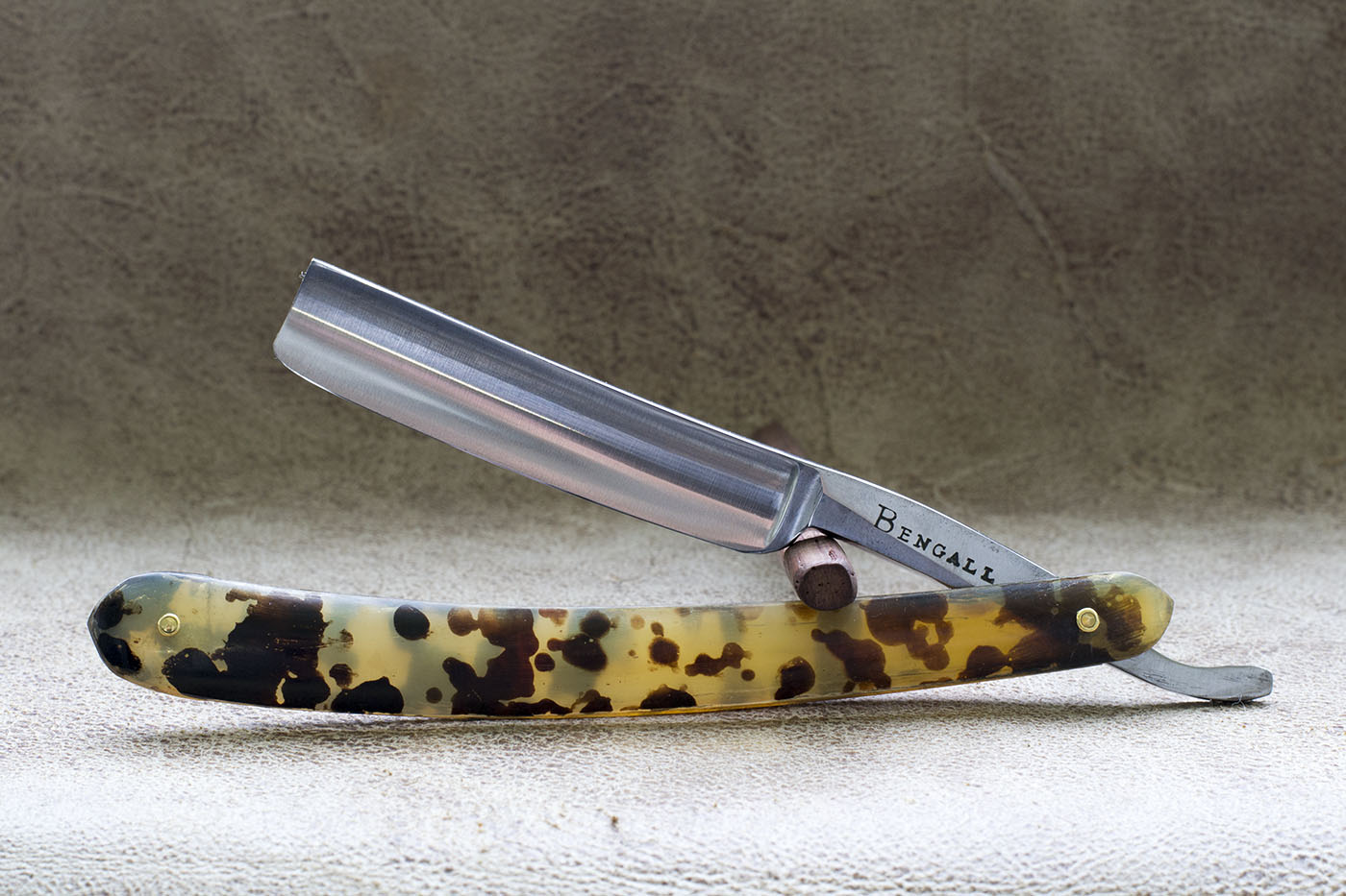 Английский Бенгалл времен Томаса Рэдли Кадмана. Рукоять из рога, протравленного под черепаху, родные латунные шайбы, ширина полотна 5/8 дюйма, клин. Период изготовления конец 19 - начало 20 века. На бритве были некоторые следы от камня на обухе и кромке, я считаю это заводской заточкой, кромка не была сведена и бриться с такой заточкой было невозможно. По сути это NOS бритва, по моим заключениям не находившаяся в использовании. Состояние полотна великолепное, заводской сатин,который намного грубее того что можно встретить на более современных бритвах, видна грубая риска от камня, полотно отполировано мной вручную. Бритва заточена и готова к бритью. Продано Spoiler Show