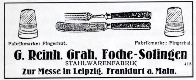 Re: Gustav Reinhold Grah, Foche, SolingenGustav Reinhold Grah, Stahlwaren-fabrik, Foche, Solingen. Находидась на Solingerstrasse, 61 в 1922 году, переименована в Wuppertalerstrasse, 61 в 1939 году. Фирма имела офисы в Remscheid, Solingen-Gräfrath, Wuppertalerstrasse в 1952 году.