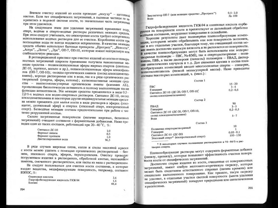Печать по книге "Производственная техно-химическая рецептура", Москва 1931г. . КОСТЬ и РОГ. I. Беление кости. 1. Беление кости. Чтобы сообщить пожелтевшей слоновой кости первоначальную белезину, практикуют один из следующих способов: а) Слоновая кость слегка покрывается тонким слоем скипидара и выставляется дня на 3 или 4 на солнце, б) Взбалтыванием перекиси водорода с эфиром или бензином приготовляют эфирный раствор перекиси водорода. Отделяют через делительную воронку и обрабатывают этим раствором перекиси водорода, содержащим приблизит. 50 (по объему) кислорода, кость или рог. Этим способом одновременно растворяется жир и подвергается белению кость. Однако этот способ очень дорогой, в) Сначала кости обезжиривают обработкой эфиром или бензином и затем кладут в водный раствор фтористой кислоты, содержащей 1 % безводной кислоты, г) Обработанные предварительно бензином или эфиром кости кладутся в теплое место; когда последние следы жирорастворителя исчезли, кладут кости в смесь равных объемов перекиси водорода и воды и держат в ней до тех пор, пока они не выбелятся. Затем их моют в чистой воде и сушат, д) Слоновую кость погружают на некоторое время в перекись водорода, после чего ее насухо вытирают. Чтобы ускорить процесс беления кости подвергают ее действию лучей синей кварцевой электрической лампочки (что употребляется для лечебных целей). 2. Отбелка пожелтевших клавишей музыкальных инструментов. а) Клавиши обмывают раствором соды и затем покрывают растертой с водой в кашицеобразную массу хлорной (белильной) известью, которая должна оставаться на клавишах в течение 8- 12 час. Затем клавиши вытирают мягкой тряпкой. Необходимо тщательно избегать соприкосновения с металлическими частями. б) Клавиши непрерывно смачиваются водой, помещают под стеклянный колпак и подвергают в течение нескольких дней действию солнечных лучей. в) Клавиши кладут в смесь из 1 скипидара и 3 спирта и подвергают действию солнечных лучей. Все эти способы отбелки применимы вообще для пожелтевших изделий из слоновой кости. II. Протравы для кости. Анилиновые протравы для кости. Травление кости анилиновыми красками проще, чем другими способами, так как оно ведется в холодной ванне, чем устраняется возможность растрескивания предметов. Травление производится следующим образом: предметы кладут в таз и наливают столько воды, чтобы они были совершенно покрыты ею. Затем к жидкости прибавляют 2 чайные ложки уксуса и около 1 г краски, причем все равно -растворима ли последняя в спирту или в воде. Для нужных оттенков выбирают подходящие анилиновые краски или составляют их из нескольких. Костяные предметы оставляют в жидкости на 4 - 8 час. и вынимают тотчас же по достижении желаемой густоты тона. Затем их обмывают водой, высушивают и полируют венской известью с мылом. Спиртовые лаки и политуры здесь нельзя употреблять, так как они могут растворить краску на поверхности кости. Если нужно окрасить бильярдный шар из слоновой кости в два цвета, параллельными полосами, то его уже отшлифованным зажимают между тремя тонкими палочками, вставленными вертикально в небольшую дощечку, покрывают среднюю полосу масляным лаком и окрашивают сперва один сегмент, погружая им шар вместе с дощечкой в соответствующую анилиновую протраву. Окончив окраску, дают ей просохнуть, а лак счищают ск