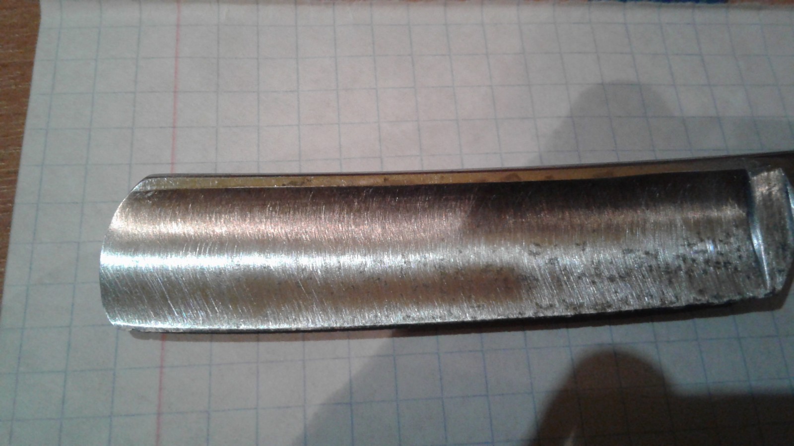 Re: Возможно ли вернуть к жизни, востановить?Судя по характеру рисок от шкурки, изделие подвергалось механической обработке; если так, то режущая кромка, возможно, уже отожжена и потеряла твёрдость. ...и немедленно выпил.