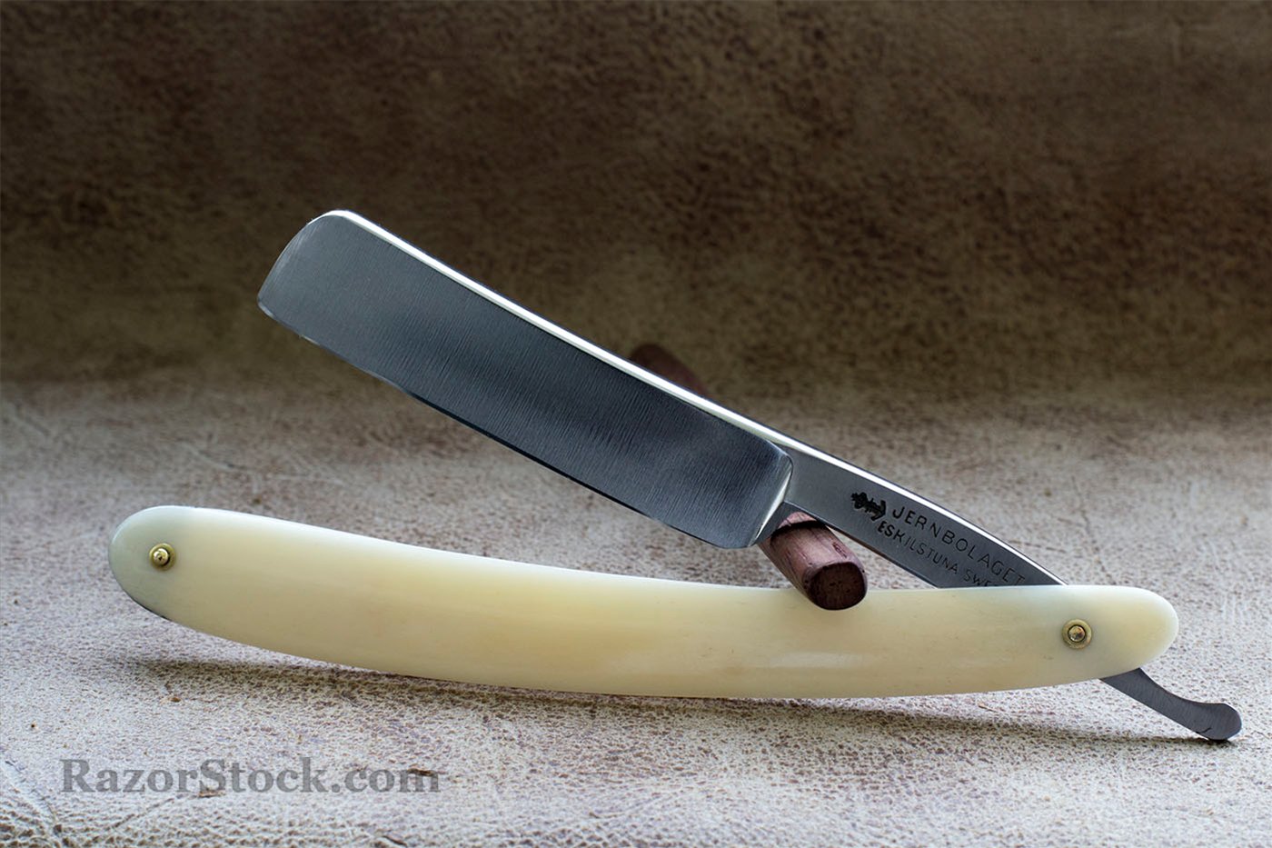 Опасная бритва от шведской фабрики стальных изделий Jernbolaget. Кроме бритв производились ножи, ножницы, инструмент и даже навесные замки этой марки. Фабрика перестала существовать в 40-х годах 20 века. Данная бритва, скорее всего, была произведена в конце 19 века. Бритва не была в использовании, но была почищена от следов времени, рукоять из пресcкартона была заменена на кость верблюда с оловянным клином. Ширина полотна 18.2 мм. (13/16) Спинка 5.1 мм., прекрасная шведская сталь. Бритва заточена и готова к бритью. Годится как для новичка, так и для коллекционера. Продано Jernbolaget Show ]