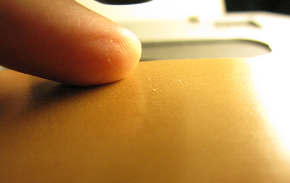 Это ресурс Джима Района и его сложно упрекнуть в придумках. Было - значит было. Тем более перкратил поставки, значит было не раз. От себя добавлю фото. Подробно расписывать не хочу, но эти штуки царапают. На мой взгляд, сейчас важнее как ремень приготовлен к работе, а не из какой кожи сделан, её сейчас подобрать приличного качества не проблема, специально для бритв кожу всё равно кроме Каноямы никто не готовит, а замусоленный винтаж только видимость ремня. Комплексное решение заточки - подбор и подготовка к работе сетов на основе синтетики и/или натуралов, нагуры, притиры, мусаты и ремни для правки.