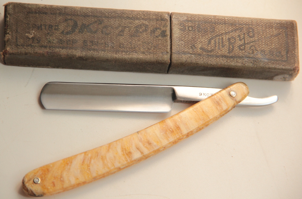 Бритва достаточно редкая и в очень хорошем состоянии для своих лет.Ручка и медные пины родные. Ничего не разбирал, а только немного почистил полотно от патины. Оставил немного патины на эрле, чтобы не стереть штамп.Сталь и кромка чистые. Идеальная геометрия.По всей видимости бритвой пользовались мало и аккуратно. Отличный, коллекционный вариант.