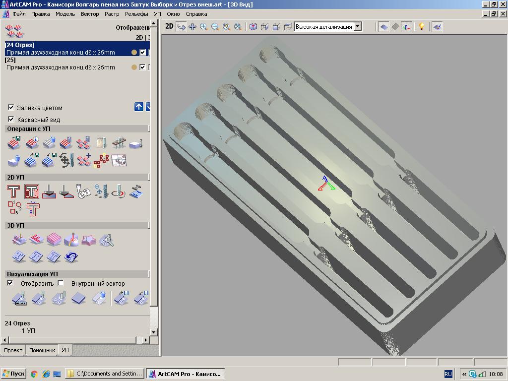 Поскольку размеров камисори своей ты не дал, то вот слепил за пол-часа нечто под камисори типа (под фрезы и дерево, что у меня есть сейчас): размеры использованных выборок: 1. под клин - 60х6х25мм 2. под ручку - 110х10х12.5мм (2выборки и 2перехода) 3. 1й переход - 8х3.5х6мм (опирается шейка бритвы - между ручкой и клинком) 4. 2й переход - 8х10х8мм (опирается/фиксируется боковыми сужениями/если надо/ ручка бритвы, ближе к концу ручки) 5. Общая длина (габарит) камисори - не более 170мм 6. размеры пенала (низ) - 22х180х27.5мм 7. крышка - 22х180 х 10мм Итого, высота пенала со вставленной крышкой тут - 27.5+10-2=35.5мм тогда габариты пенала с закрытой крышкой итоговые - 22х180х35.5мм Это по самым простым стратегиям обработки - "2д выборка" двумя фрезами - d6 & d3.175. Крышку можно нарисовать исходя из реально нужных параметров ручки - бывают ручки у камисоров и тонкие и толстые. В принципе, если не нужно ничего "рисовать на корпусе", то и всё (кстати для меня это ещё несколько проблемно в связи с переустановкой заготовки и её центрированием, но можно и "порисовать-повырезать", в принципе, например "To: Volgar" ) на крышке. Загружаю постпроцессор в станок и за пол часа всё будет готово, как-то так, набирал этот текст дольше. PS добавил 2 вида крышки - сечение и аксономеитрия...