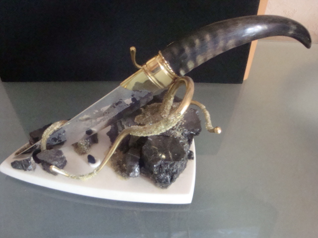 - Самодельный нож. Ручка из рака горного козла, поставка: мрамор и ещё какое-то ископаемое