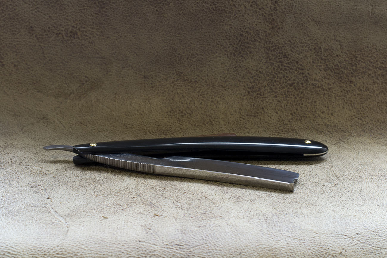 Английская бритва от известного производителя, только известен он не по опасным бритвам а по другим изделиям стальной промышленности, таким как безопасные бритвы, ножи, карманные ножи и прочая полезная в хозяйстве стальная мелочь. Бритвы весьма удачны в плане геометрии и стали – хорошо точатся, имеют довольно узкую и ровную кромку, данный экземпляр так же снабжен рукоятью из слоновой кости, ширина полотна 20 мм, бритва имеет отчетливо видную вогнутость со ступенькой, так называемый bellied ground но по сути бритва почти не отличима от таких же экземпляров с простой полной вогнутостью. Бритва была заточена мной впервые и никогда не была в использовании. Продано Lockwood Show