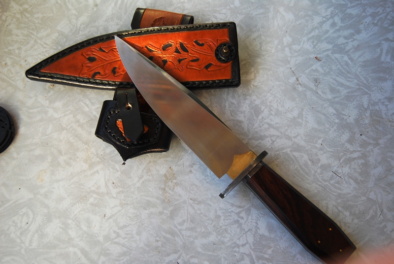 Очень давно питаю слабость к классическим Боуи.. Заказ долгострой..зацените работу 2 наших коллег сразу Нож - углеродка У10а, хабаки латунь, гарда дамаск , рукоять айронвуд -работа Арма Ножны растишка , тиснение , покраска -работа Ромы В руке сидит как влитой, классика есть классика - даже если американская Сделал фото , добавил размеры ...ну если и теперь не устаивает - ну я не знааааааюююююю...