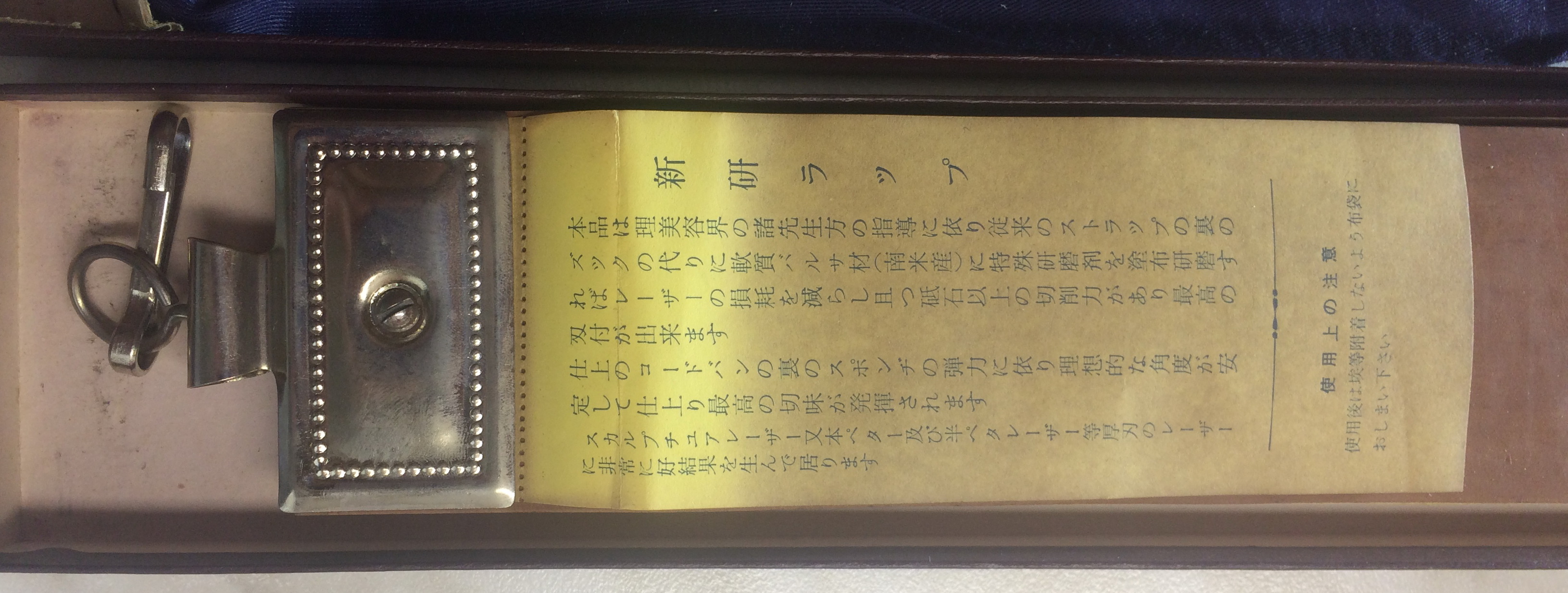 Кожа совершенно не испорчена временем, не имеет никаких дефектов.Мягкая, эластичная.Что интересно, ремень также укомплектован дощечкой, из оригинальной японский породы дерева. На дощечку наклеен мягкий материал, типа поролона . Это даёт возможность производить правку как в подвешенном состоянии, так и на столе. При этом ремень не требует контроля над натяжением ремня. Очень удобная и качественная вещь.Рекомендую в особенности новичкам.!Не пропустите!