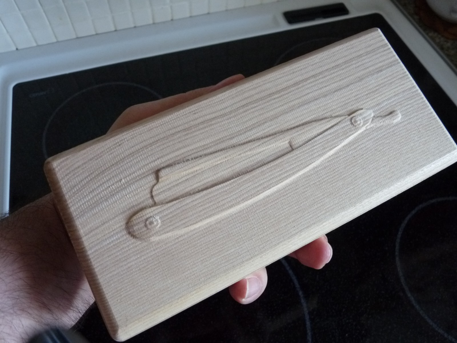Кофрик на 6 бритв, 3 побольше (ручка - 145мм) + 3 поменьше (ручка - 140мм). Дерево - ясень. Высота рельефа бритовки - 2,538мм по нижнему пину. Примерил бритовки, спецом взял 5 черных и 1 белую, ибо фетр взял черный (гурманю тут вишь ли Кофрик вышел чуть уже и чуть длиннее дубовой "недельки", что была выложена выше, зато вырезы под хвосты для нижних пинов были увеличены для того чтобы могли влезать кроме утончённых слоновых хвостов англов и советских в расцвете бритв. Да и длина под ручки тоже немного больше. Но всё же это 5/8 и 6/8, однако 4/8 там утонут - не пойдут. Предотпускной каприз эдакий. Золотое сечение... PS фетр просто вставлен, не закреплён, ибо ещё не доработано. последнее фото - те самые вырезы (ещё не ошкурено) - видна ступенька - верх обработан конической фрезой, книзу - обычная сферическая цилиндрическая. И разные размеры вырезов - с краёв побольше, к центру поменьше - симметрия... И виден рельеф дна короба - тоже рельефная выборка, повторяющая изгиб ручки бритвы. Кстати рельеф дна, как и рельеф крышки изнутри можно сделать тоже волнистым - бритва как бы лежит на дне волны и волной (крышки) прикрывается Ну понятно, что волна крышки будучи прикрыта фетром будет выглядеть как волна фетра... (волна вдоль ручки бритв - 6 бритв = 5 волн + 2 полуволны, объединённые со стенками), для удобства фиксации бритв в закрытом положении коробки, ну и для красоты для (или это излишне?). PSS Кстати,футлярчик из сушёного ясеня с шестью моими бритвами и фетром весит 501грамм, без бритв = 230грамм. При этом это вес до обработки маслом.