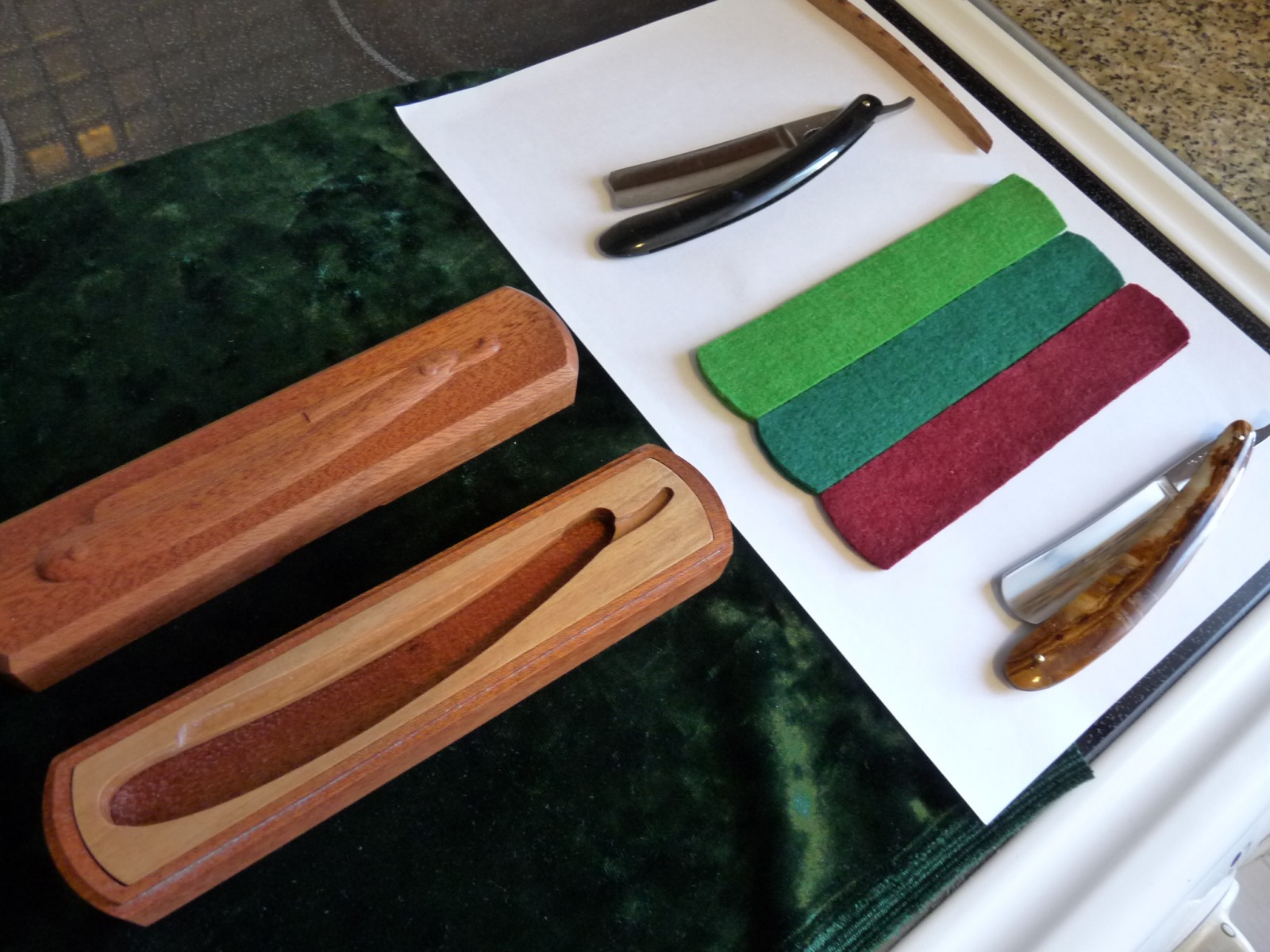 Кстати, нравятся Камы 1956г. ЗТВ (с парикмахерскими носами которые), чотто мне только эти попадаются, с черными ручками - большинство сделаны из гагата (скорее всего), но вот этот экземпляр, что в футлярчике лежит - тоже чёрная ручка, но на свет всё же просвечивается и там, внутри, как бы разбросаны типа блёсток - пластик - вероятно что-то переходное или раннее по сравнению с гагатовыми... (это только Антон знает!) To: Anton Да по технологии ткань и не нужна для фикса бритвы в этом коробе (да и там на крышке изнутри сделана посвящаемая надпись, закроет тогда её), но можно и так - на 0,5мм углубить выборку в корпусе или во вкладыше, что ещё проще - и будет фетр или бархат... вот на фотках лежит - как подложка - зелёный "мраморный" бархат, а есть ещё мраморный чёрный... ну и море разного фетра... (в основном зелёного) PS Вот для бритвы, футляр для которой делаю по её фото с размерами, там будет нужна подложка в крышке - 100% - от греха и для запаса мягкости фикса бритвы, а вот тут - бритовка у меня в руках и я всё (!) учитываю! Компенсация всё же и тут тоже есть - внизу лежит фетр - под вкладышем. И он может быть разной толщины. PPS Для понимания устройства короба - там вдоль периметра под вкладышем (у дна) идёт ступенька, глубиной 1мм и шириной 0,3мм (видно слева на фото 3 сверху у корпуса). Под фетр толщиной 1мм. То есть вкладыш лежит на ступеньке (не на дне). А вот бритва лежит во вкладыше, но может опираться глубже вкладыша и на фетр непосредственно. И сам вкладыш может опираться и не на ступеньку, или не только на ступеньку, но и на фетр, если он толще 1мм. Таким образом достигается как бы двойное мягкое "фиксирование" бритвы без напряга в футляре. То есть бритва там и не болтается и не жёстко зажата деревом с двух сторон. Таково моё "инженерное" решение фиксинга бритвы в футляре. Если бритва инородная для конкретного футляра+вкладыша, то можно добавить ещё слой фетра на двойной скотч - по крышке снизу. Это регулировка на усмотрение владельца бритвы.