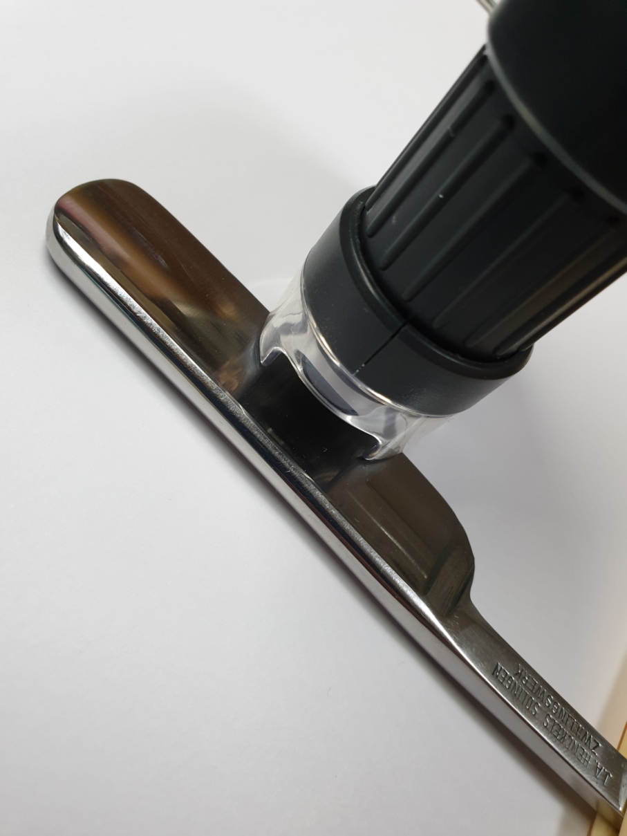 Оптика в помощь заточнику (лупы. микроскопы).Я делаю иначе. Кладу бритву на ровную устойчивую поверхность белого цвета (сильно помогает подстветке) и ставлю микроскопчик на плоскость клинка. Выставляю резкость и затем не отрываясь от окуляра плавно без нажима перемещаю прозрачный наконечник прибора вдоль клинка. Бритва при этом неподвижна. Прибор опирается на плоскость клинка.Рабочая кромка не цепляется, проблем нет. Широкий прозрачный наконечник обеспечивает устойчивость прибора на клинке.