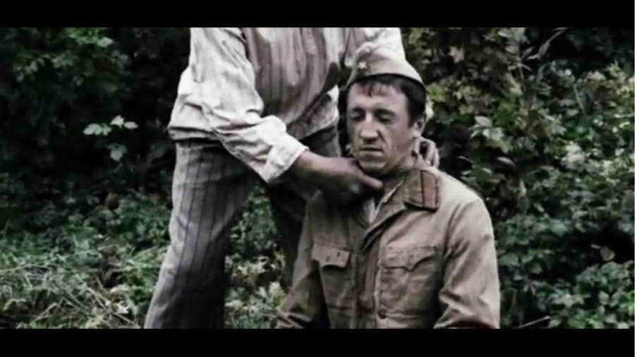 Сначала немец бреется на поезде. Ну, а после крушения поезда героиня Румянцевой бреет своего командира.