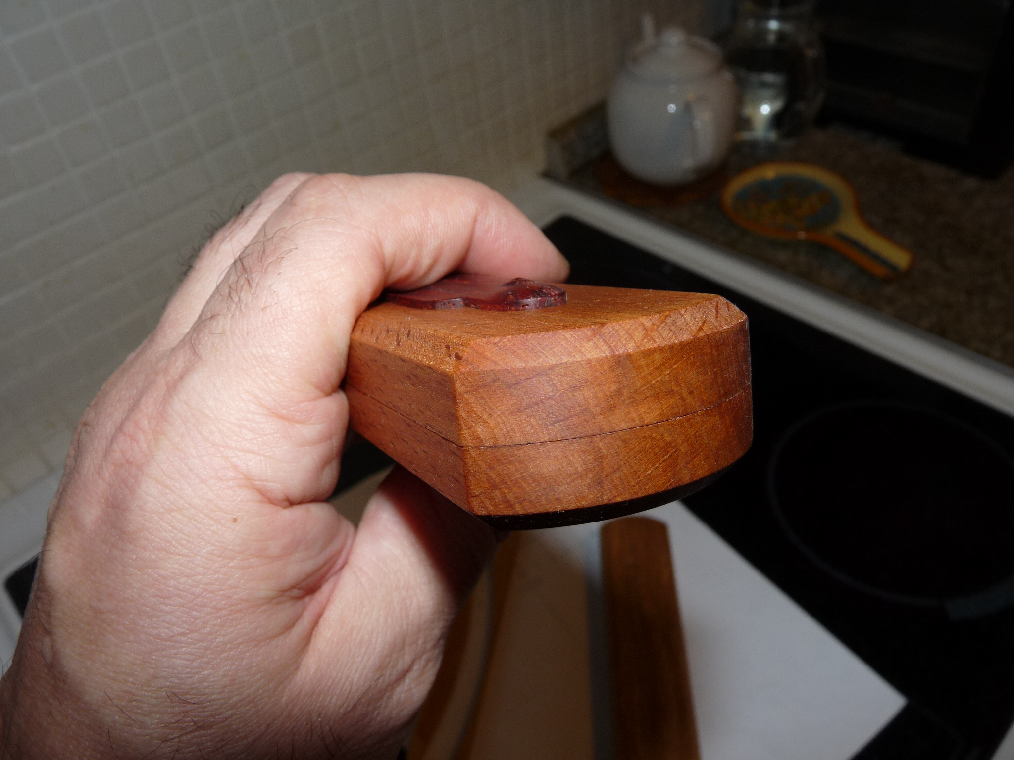 Из тем про Востенхольма. И тогда немного самокритики - не совсем понравился термоясень всё-таки как материал для тонких работ (но например в качестве футляра для камня - зачёт полный) , так как выходы годовых колец довольно пористые (именно на термоясене, на просто ясене - нормально) и как их закрыть для последующей отделки лаком, например, непонятно - впитывается лак до условной бесконечности... а если закрыть их чем то иным (порозакрывающим), то не факт, что нормально ляжет и не облезет уже тот же лак сверху этого радикального. Воск то лёг туда, и закрыл, но он получается немного белесый. Если нагреть поверхность, например феном, то белесость жилок уходит, но... в общем есть такой грех... впрочем это всё-таки не очень большой грех, наверное...