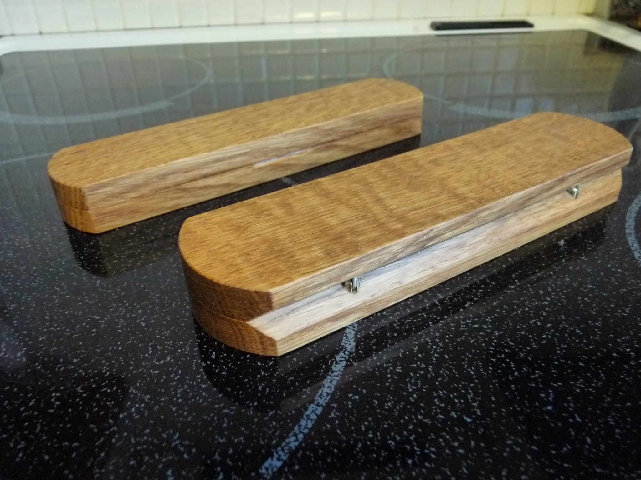 Re: Футляр для опасной бритвыВ этот раз представляю многоуважаемой публике наипростейшие 2 модельки футляров из дуба, которые можно делать быстро и не дорого, вплоть до комплекта "сделай сам", если есть у интересанта даже минимальные навыки да шкурки (ну и масло/воски/лаки...).