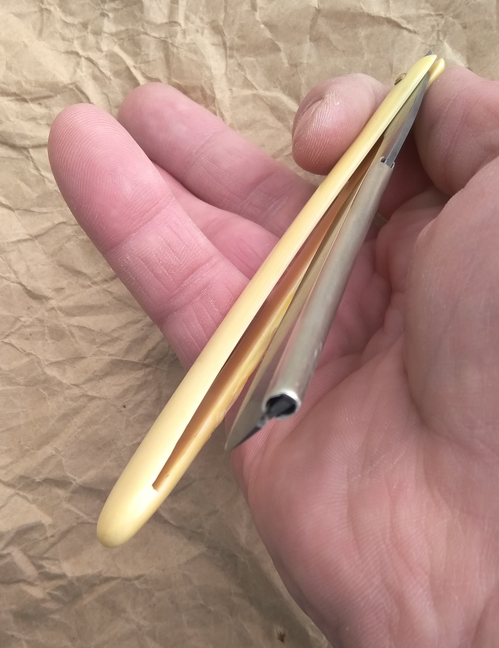 Начнём. Было: Сняв только осевой пин, решил оправу вылизать не разбирая полностью.Клинок почистил и протравил в электролите там где было воронение. При сборке оправа лопнула с обеих сторон. Взял суперклей, пыль от рога, склеил и собрал по-новой. После полировки оправы вокруг пина осталось мутное пятнышко, что и следовало ожидать. Подумал, а почему бы не сделать частичную брошировку. И дремелем на низких оборотах металлической щеткой начал елозить. Кинулся рьяно точить, наклеив две изоленты. Но не тут-то было. В итоге дошло до шести. Можно, конечно, сделать регринд. Но решил оставить в назидание себе.