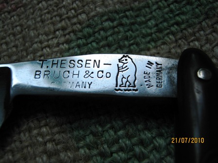 Привет всем, мой Ермак немного отличается по эрлу , ручка бекелитовая ,замененная см.фото,от фирмы T.HESSEN BRUCH Solingen (медведь с дубиной,или посохом)смотрел  ,но так и не разобрался, хотя у меня подозрения - американцы! Заодно,для просмотра бритва этой фирмы ,ручка из рога.
