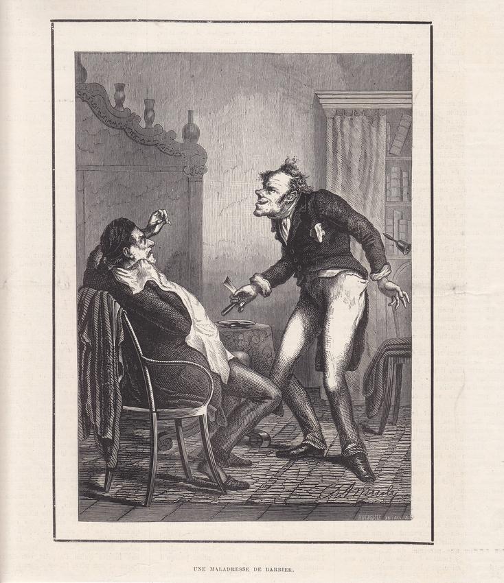 Опасная бритва в искусстве (картины, рисунки, фото, тату)Бритьё со смертельным исходом, юмористическая гравюра на дереве