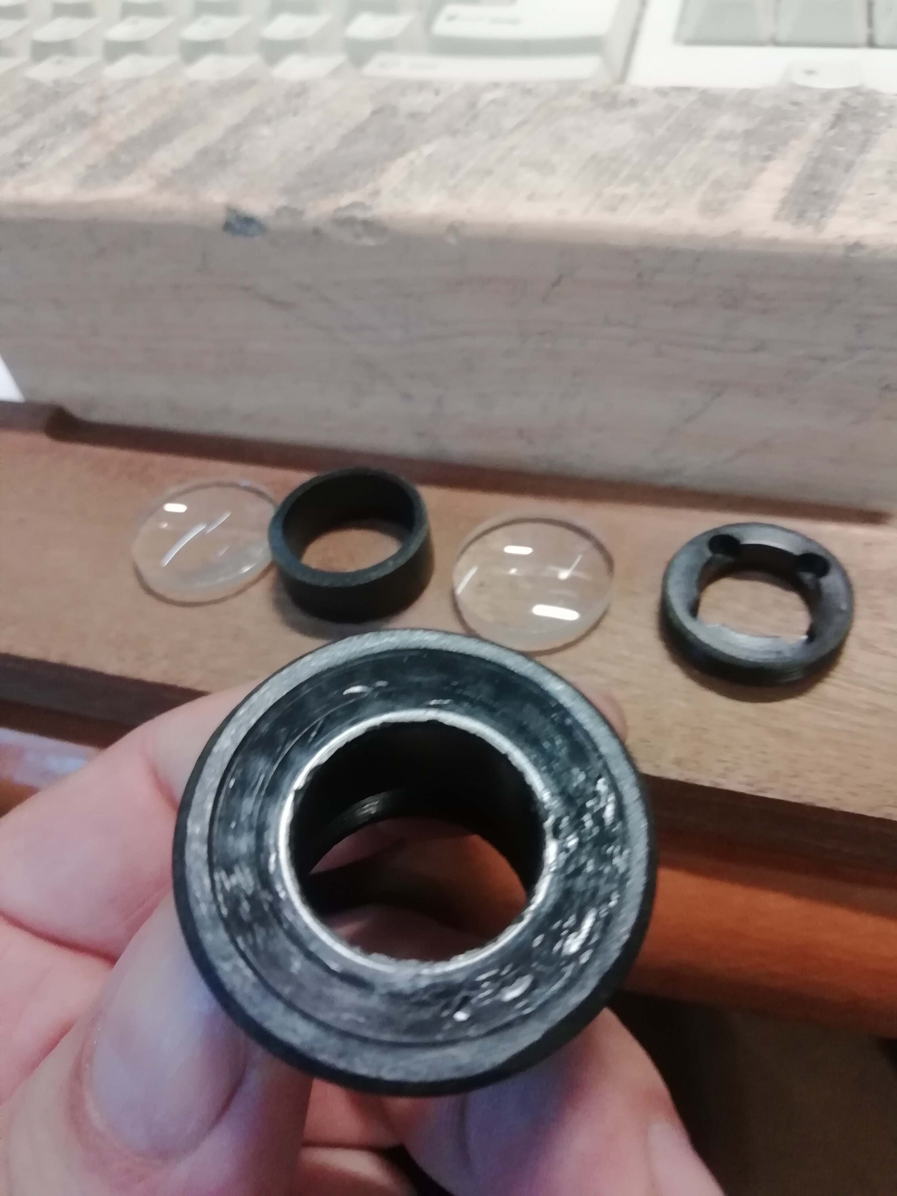 Вернулся и разобрал. Линзы у меня другие, тоже стекло, но менее толстые и стоят через проставку. Потому увеличение иное чем у тебя и гораздо больше 8х по ощущениям. Может реально какая то подменная/сменная лупа, ведь их сменить легко, а увеличение должно быть разным. Пошурши у себя в закромах, может и у тебя сменные лупы есть, с бОльшим увеличением... Вряд ли там что побольше (тубус + объектив +окуляр) было, хотя всё может быть, конструкция позволяет.