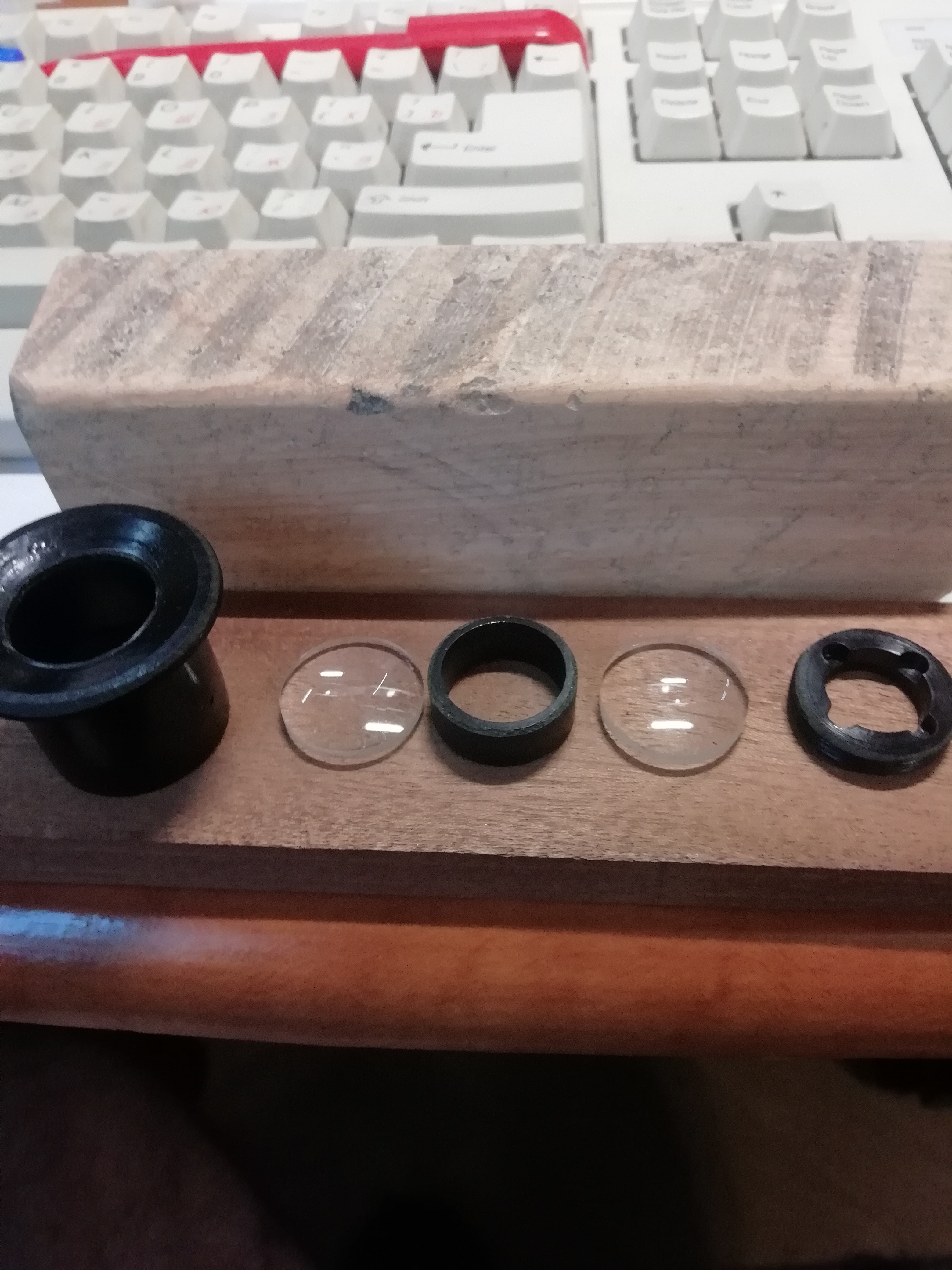 Вернулся и разобрал. Линзы у меня другие, тоже стекло, но менее толстые и стоят через проставку. Потому увеличение иное чем у тебя и гораздо больше 8х по ощущениям. Может реально какая то подменная/сменная лупа, ведь их сменить легко, а увеличение должно быть разным. Пошурши у себя в закромах, может и у тебя сменные лупы есть, с бОльшим увеличением... Вряд ли там что побольше (тубус + объектив +окуляр) было, хотя всё может быть, конструкция позволяет.