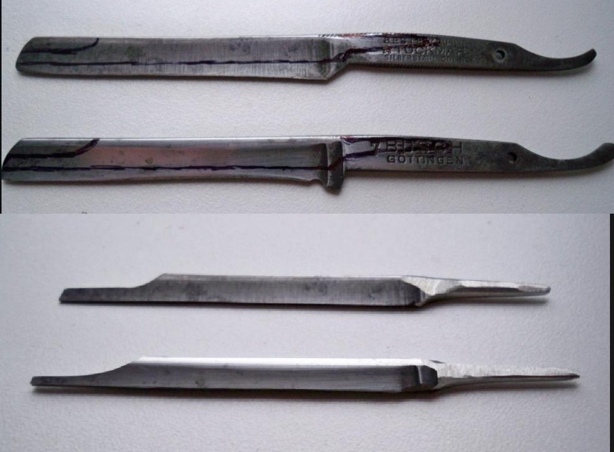 можно лишь заточить то, что осталось от бритвы, возможно, если попотеть, придать форму бритвы гораздо меньшего размера, по ходу дела убрав патину, ржавчину и прочее, но стоит ли? вот я купил недавно бритву из-за ручки: И как ты ее собрался восстанавливать? Из родных 17мм там 9мм у носика и 11мм у пятки, плюс неравномерно сточенный обух. Тема - "использование обмылков", а использовать их можно так: (с форума граверов, изготовление штихеля) Вероятно есть исключения, когда очень хочется побриться бритвой 18 века, где тигельная сталь, ручная ковка, но от которой остался обмылок. Однако ратовать за любой обмылок я бы не стал. Отработала своё бритва, спасибо ей и на покой..... А ручка еще послужит))
