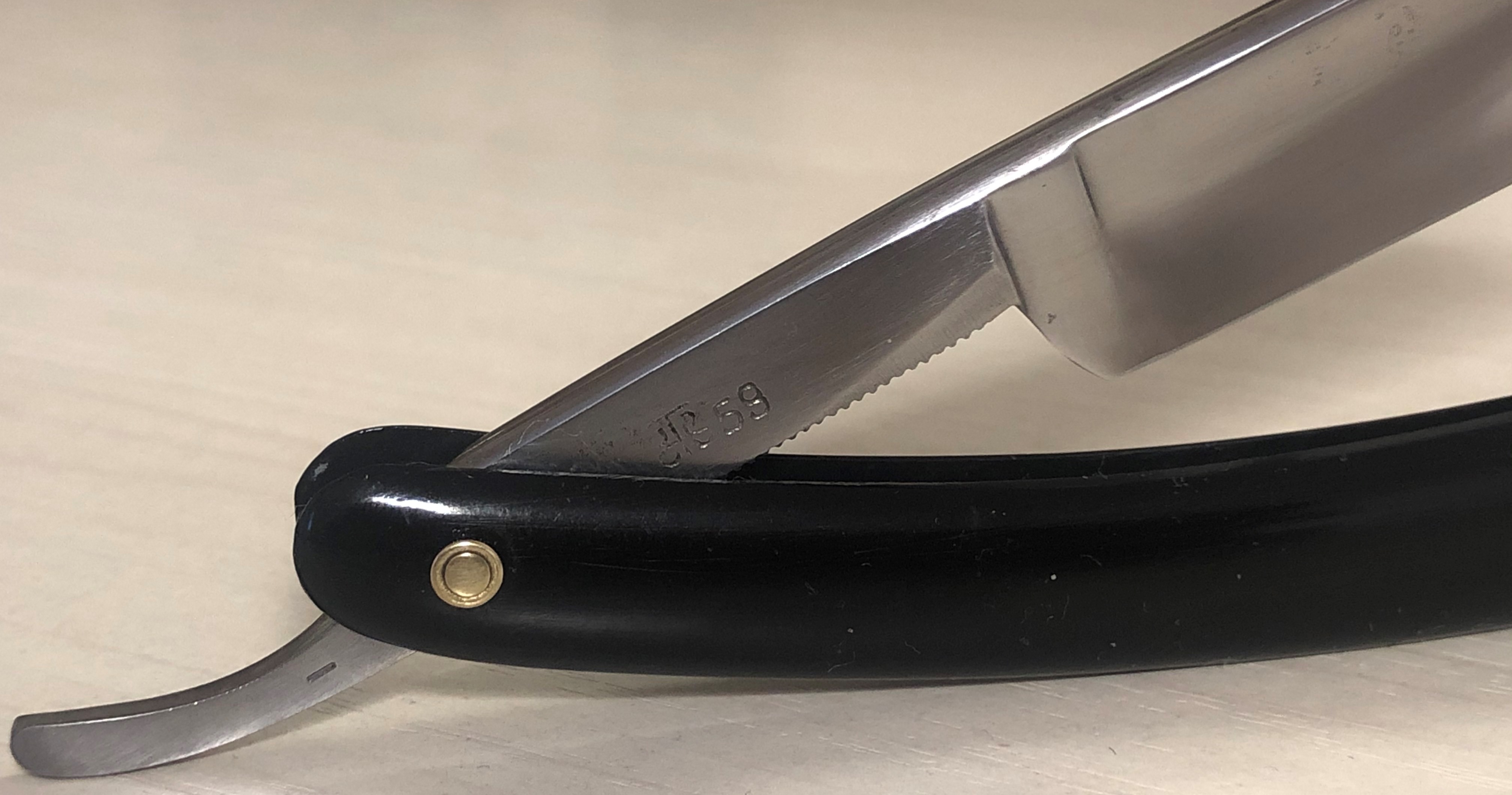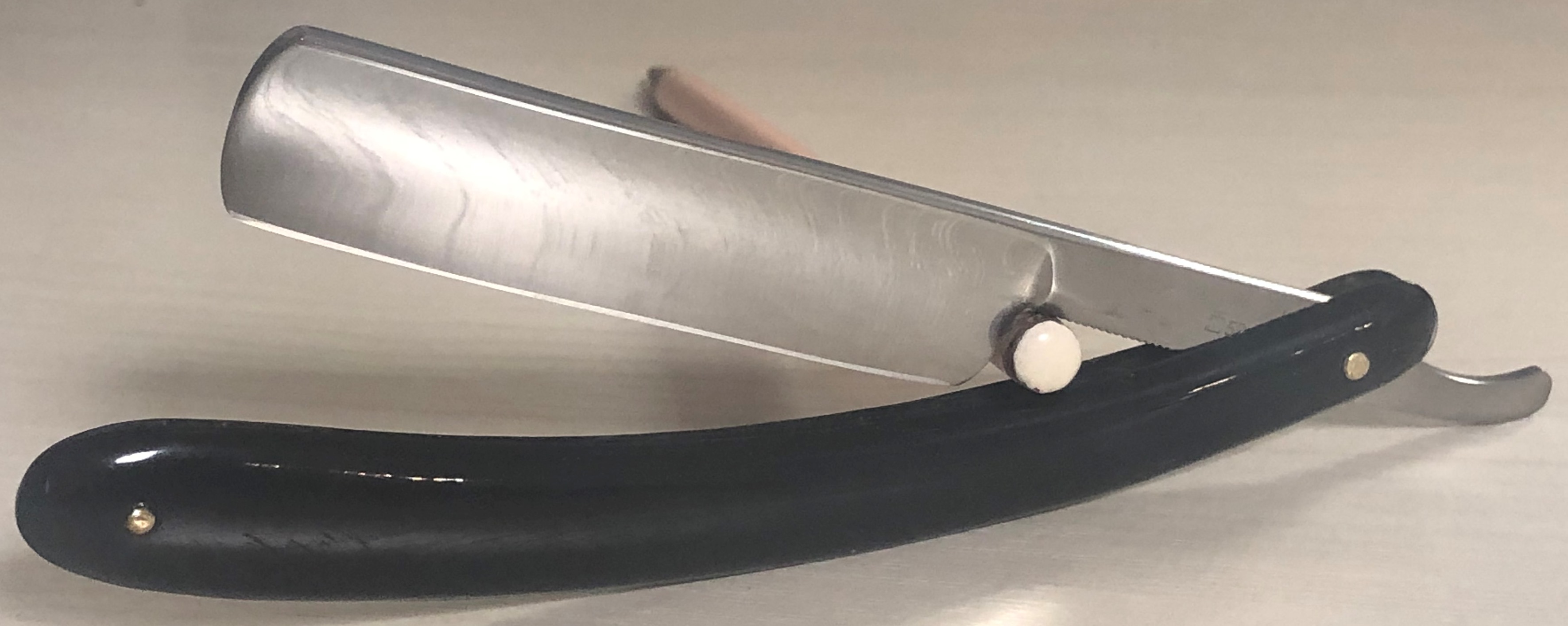 Ширина полотна-20 мм Толщина обушка-6.5 мм Углеродистая сталь. Форма лезвия-1/2 клин Примерно 50-60-е годы . Весьма приятная бритва во всех отношениях. Разобрал,почистил, отполировал и снова собрал, заменив пины на немецкие втулки.Снова не стал идти легким путем и шлифовал клинок на камнях, вручную.Долго, муторно, но получаешь удовольствие от процесса, заодно всегда можно проконтролировать то, что делаешь , чтобы не убрать лишнего и не перегреть с дуру металл..Ясное дело, что задачи не стояло получить идеальное зеркало, как это можно увидеть на множестве новодельных бритв:заплывшее от полироли зеркало. Тут скорее умеренный, легкий продольный сатин, хотя под другим углом ,если смотреть, то отражение очень хорошее.Приятный голубоватый оттенок от ручной шлифовки и полировки. Короче, достаточно красивая, практичная, удобная и недорогая бритва. Сталь не имеет визуальных дефектов, геометрия на уровне.Не пропустите рабочий инструмент за вменяемые деньги. Заточена и готова к бритью. Цена-6500 р с доставкой.ПРОДАН Внимание! Важная информация! Spoiler Show