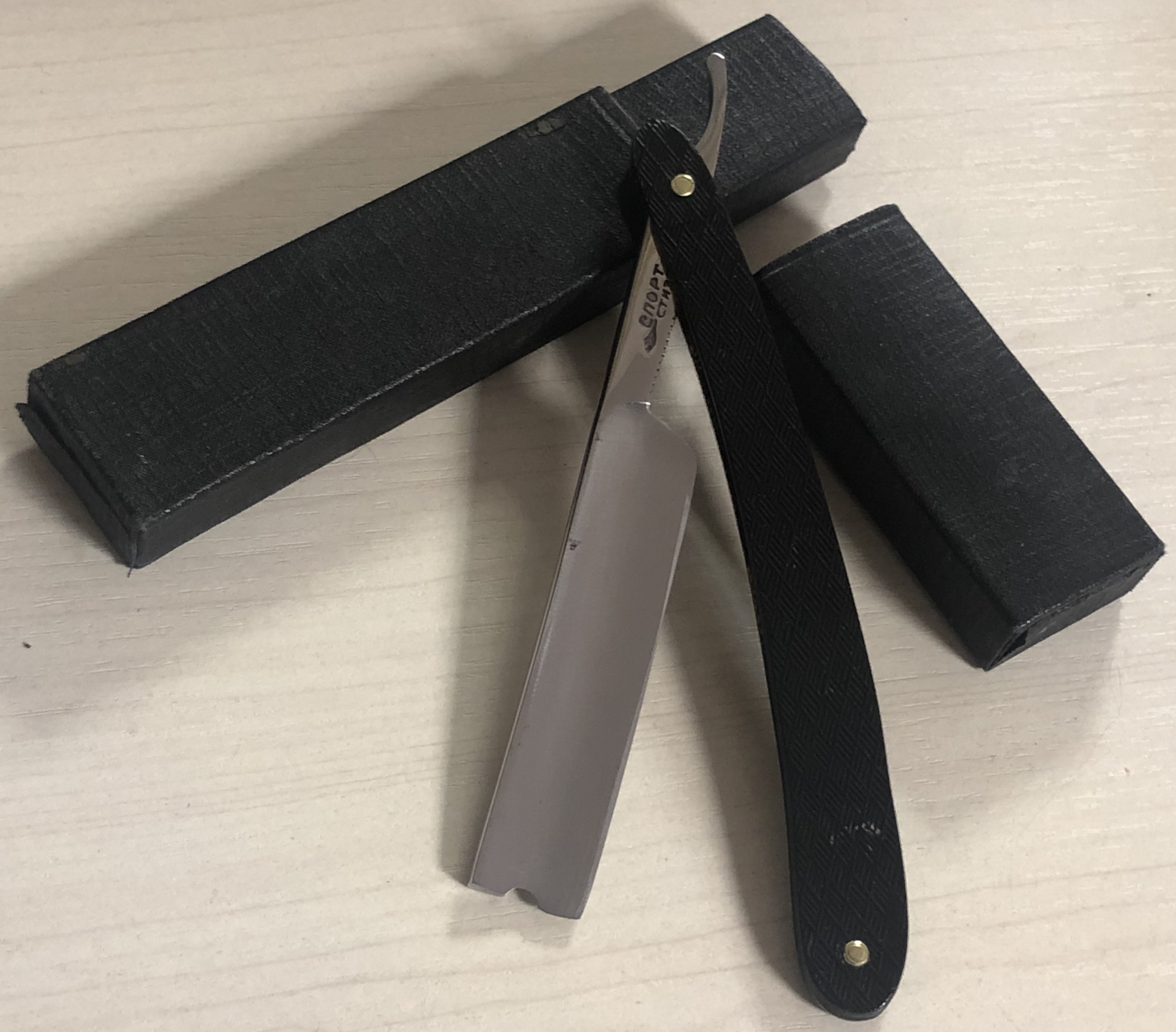 Бритва в состоянии близком к идеальному. Следов пользования не обнаружил.Разобрал, немного освежил металл на тонких абразивах, отполировал и снова собрал, сохранив родной пин.Кромочка равномерна по всей длине и практически незаметна.Сталь чистая,без видимых дефектов.Тяжёлая бритва,с элегантной формой клинка,с прекрасной"звонкой" сталью и мягким бритьём, будет очень неплохим вариантом для большинства заинтересованных товарищей.Заточена и готова к бритью.