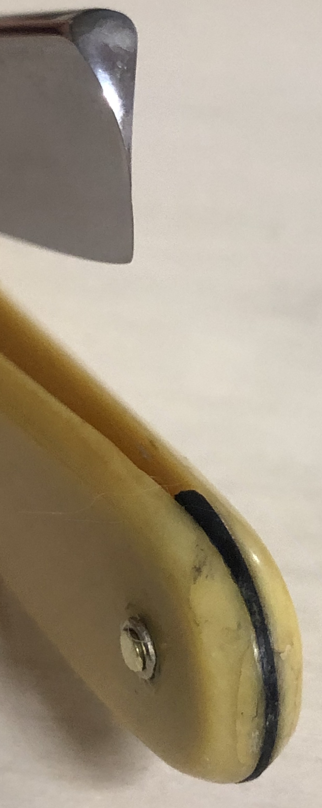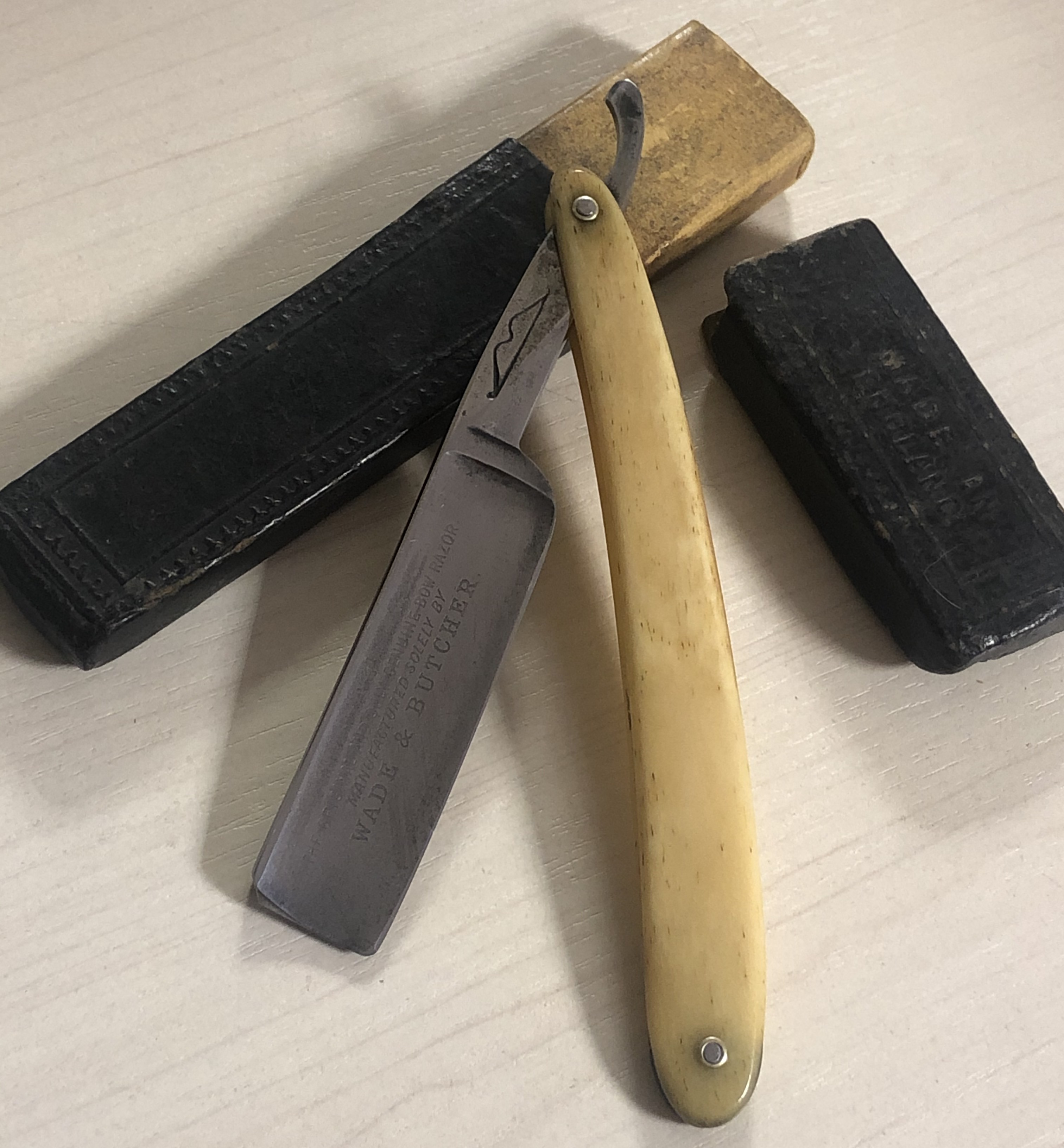 Бритва в прекрасном состоянии для своих лет, с благородным налётом патины по всему клинку, что встречается довольно редко. Естественно, удалять такой "налёт старины" у меня рука не поднимется убирать.Только небольшая чистка металла,для придания полотну равномерной патины.Бритва имеет незначительные и еле уловимые следы использования, а также"родную" шлифовку и ширину клинка, что для такого почтенного возраста является большой удачей.Грани не зализаны, а сама гравировка на полотне чёткая, без затёртостей..При разборке поменял старые пины на новые, с добавлением внутренних шайб.Идеальная геометрия полотна:кромочка равномерна по всей длине.Ручка из натуральной кости также в состоянии близком к идеальному., без трещин, отгрызанных мест или других дефектов.Мощная, красивая и тяжёлая оправа.Бритва имеет оригинальный и естественный вид, для своего возраста,без каких либо серьёзных вмешательств и может занять одно из почётных мест в любой коллекции бритвомана.Заточена, лично протестирована и полностью готова к бою.