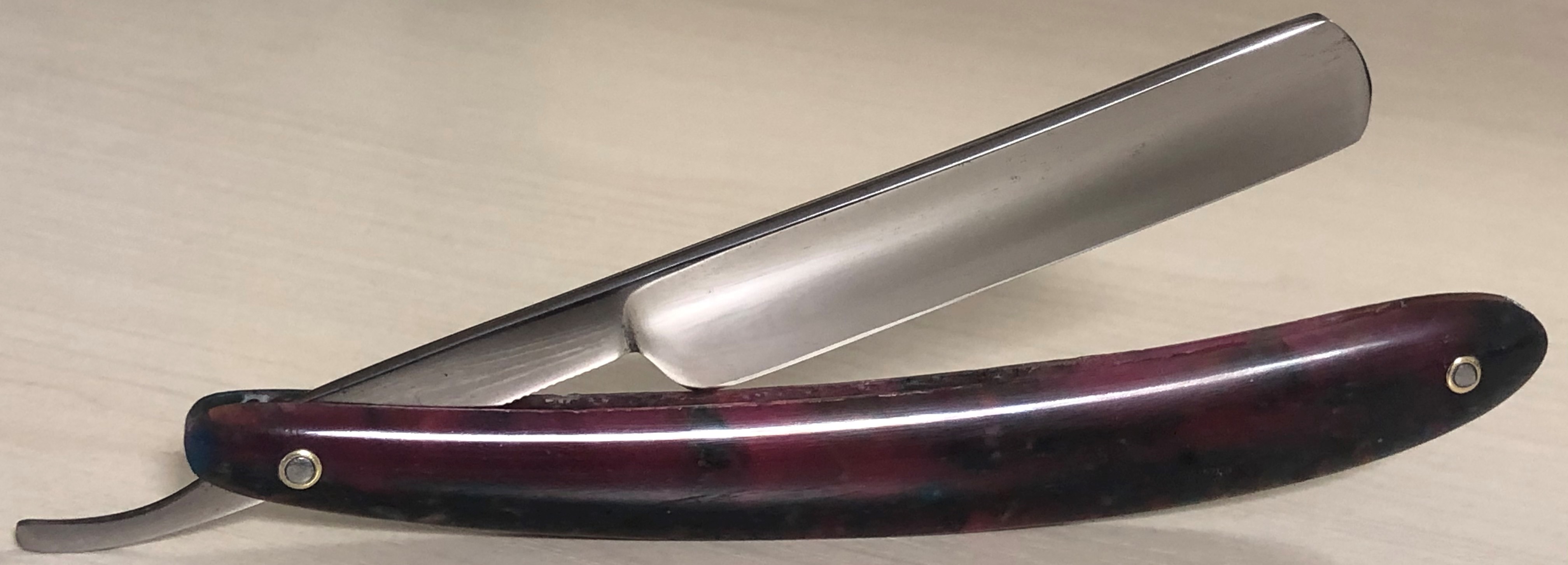 Бритва в прекрасном состоянии для своих лет. Клинок имеет остатки воронения на эрле. Разобрал, почистил металл и снова собрал, сохранив родные пины.Состояние самого клинка близко к идеальному, с практически незаметными следами пользования.Идеальная геометрия. Сталь чистая, без видимых дефектов. Очень хорошая и приятная в заточке "звонкая" сталь.Заточена и готова к бритью.