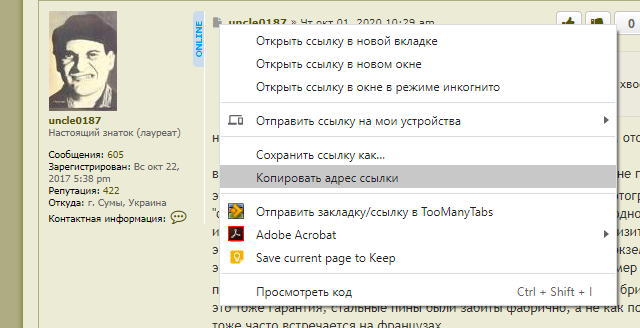 Аукционы: плагиат, развод и "великолепные" описанияПравой кнопкой на листик в углу- тынц (как на картинке), в открывшемся меню - "копировать адрес ссылки". Когда вставляешь - выдели её и нажми на значёк с цепью выше окна ответа. Это чтобы сцыль правильно отображалась. Ремонт опасных бритв, звонить с 11-00 до 23-00, +79267729357, (viber, whats app, telegram, VK), спросить Олега.