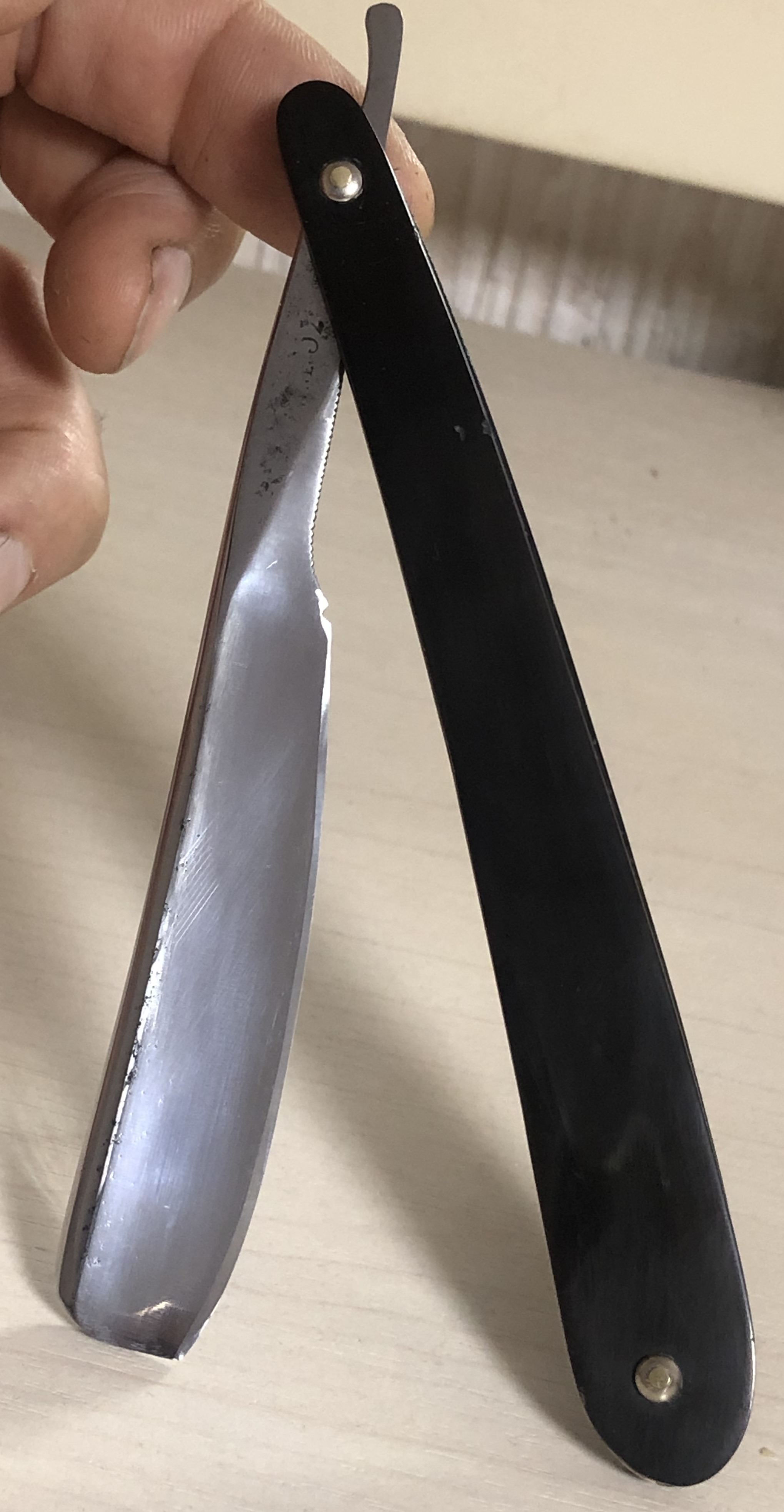 Не стал стачивать много "мяса", чтобы убрать все изъяны и рытвинки металла, а просто почистил и заточил.В целом клиночек чистый, за исключением небольшого количества у обушка.Кромочка равномерна по всей длине.Сталь очень неплохая в плане заточки, впрочем как и большинство французских бритв этого периода.Роговая оправа в очень хорошем состоянии, практически без отгрызанных мест. Массивная , тяжёлая бритва. Заточена и готова к бритью.