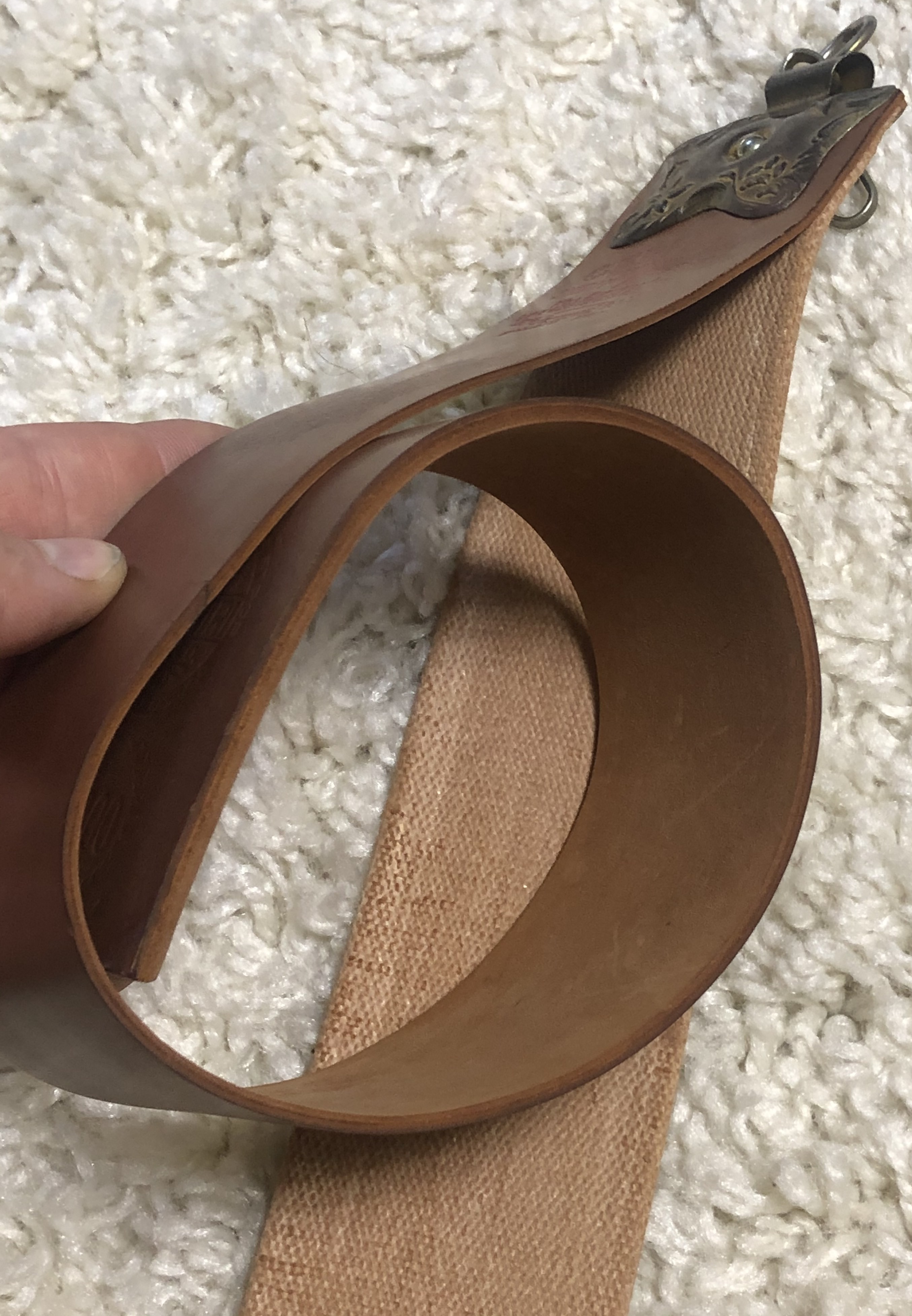 От более дорогих моделей Пеликан,этот ремень по качеству ничем не отличается.Если бы не небольшой порез, то можно сказать, что состояние ремня без следов пользования.Льняной холст не тредует никаких дополнительных работ по подготовке. Ремень полностью готов к пользованию. Не пропустите редкую вещь за приемлемые средства.