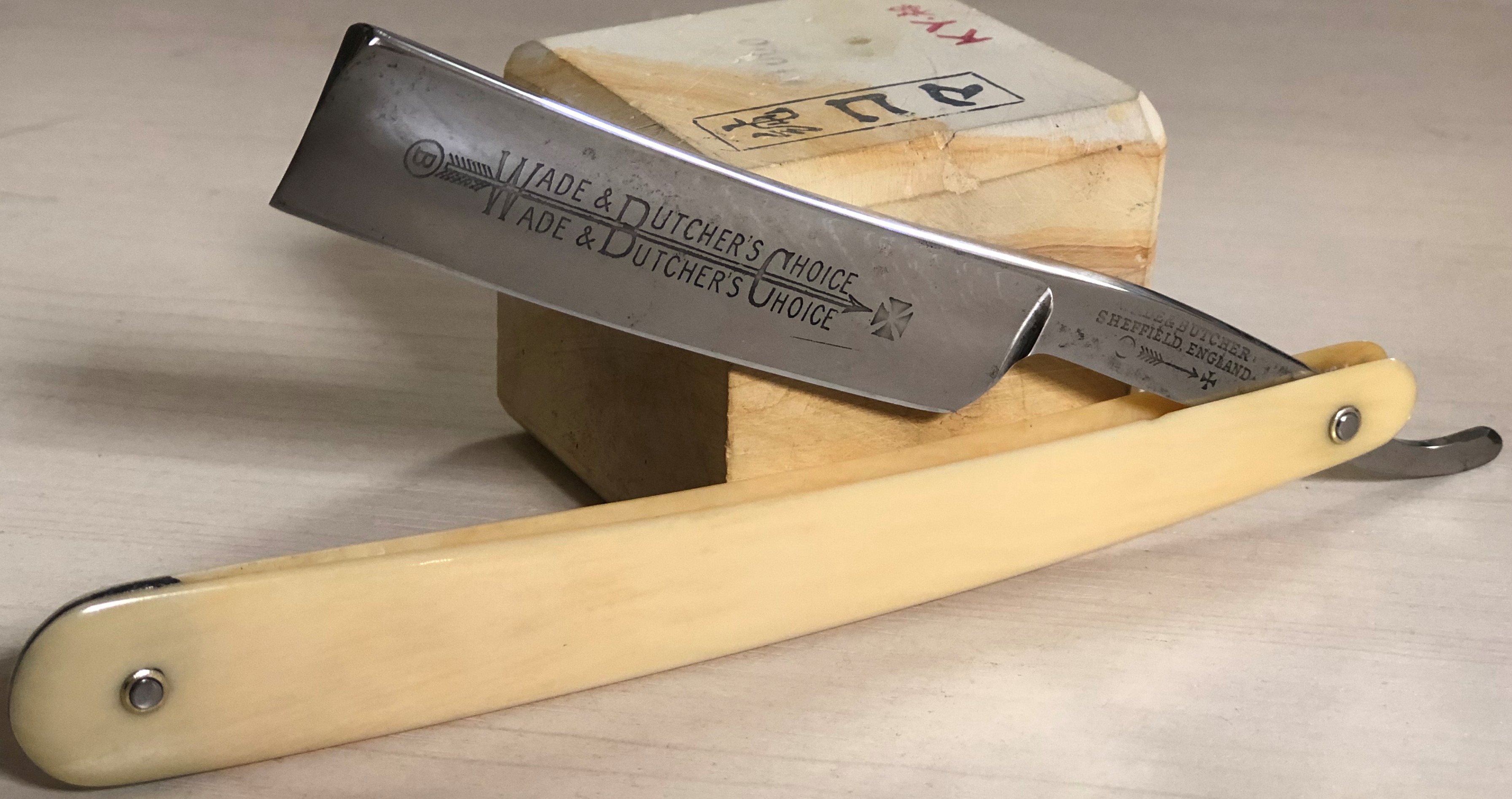 Изюминкой в компоновке данного раритета стал сюртук , пошива конца 19-го,начала 20-го веков.Имеется ввиду ручка из натуральной кости, от старинного донора. Оправа мощная, крепкая, тяжёлая, в идеальном состоянии.Пины удалось заново поставить оригинальные, от Ивасаки.Клинок в прекрасном состоянии,без видимых дефектов. Идеальная геометрия полотна:кромочка равномерна по всей длине.Сталь звонкая, отличного качества. По всем параметрам твердая, больше подошла бы для жёсткой щетины, но и для опытного пользователя будет очень неплоха. В общем и целом я доволен своей работой. На мой взгляд, отличная вещь для повседневного бритья.Заточена и готова к бритью.