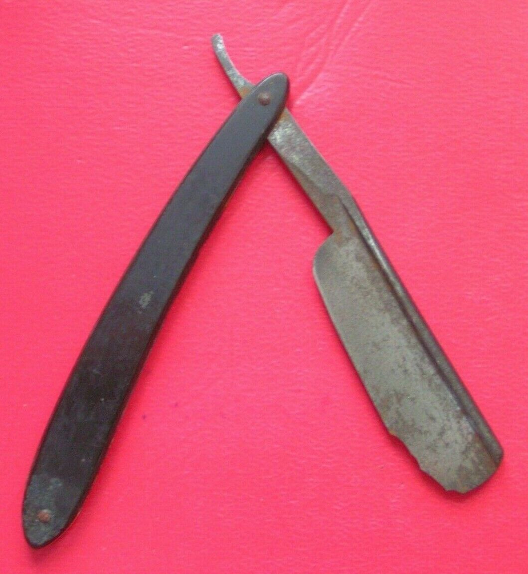 Бритва до... и после...Появился в хозяйстве почтенного возраста безымянный француз. Клин довольно старый, сработан около 1870 года. Одна из плашек оправы была выгнута, родные стальные шайбы съела ржа. Поэтому производилась полная разборка. Плашку варил раза три пока не выровнялась. Так что ручку оставил родную.