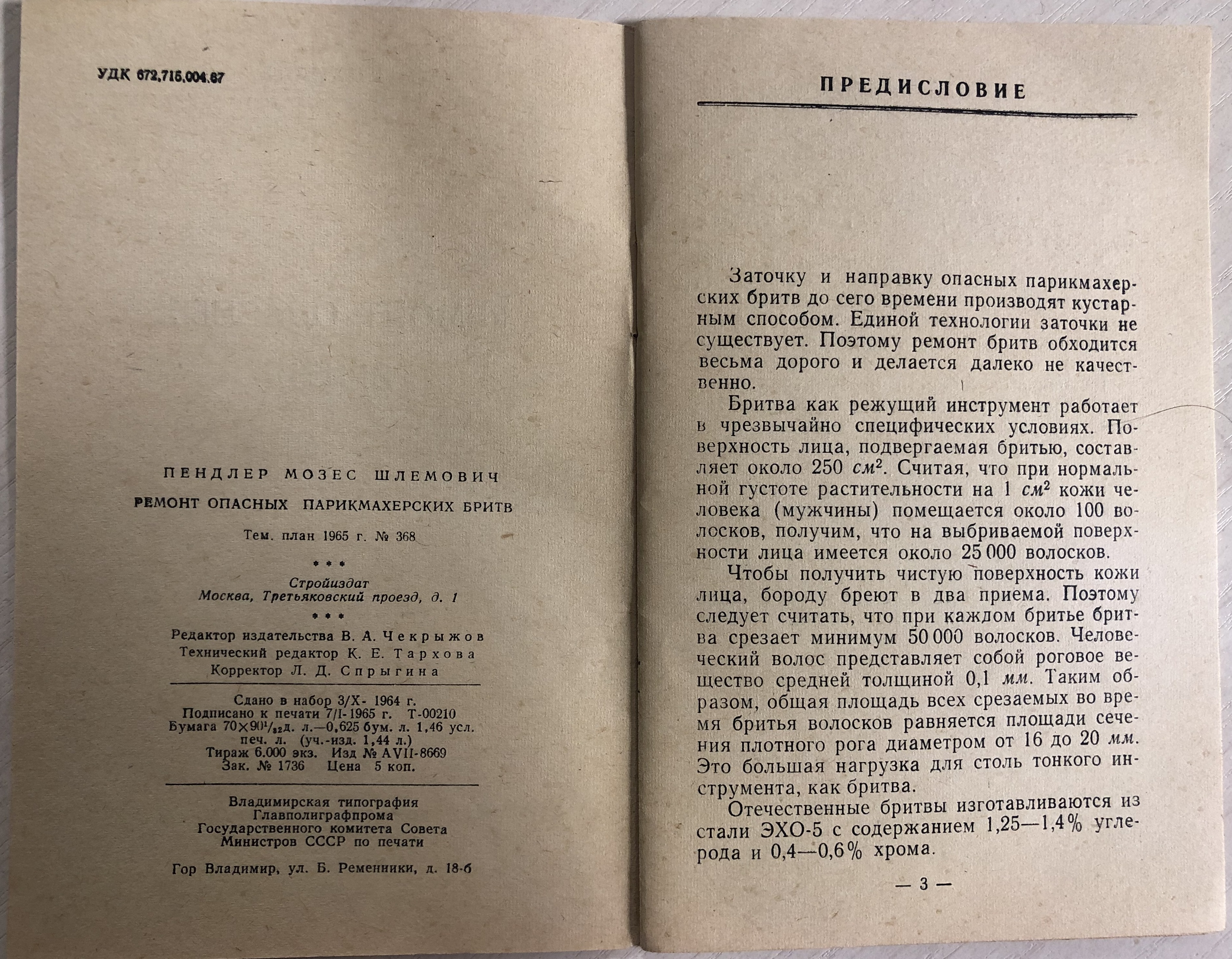 "Брошюра *Ремонт опасных бритв*" мы будем выходить на сайт Алекса-Манаха. А тут на форуме не нашел сканов этой самой брошюры. Ну вот и решил прикупить недавно один экземплярчик, чтобы напрямую выложить его сюда ,и чтобы другие товарищи не искали ничего подобного на стороне. Понятно, что информация там не нова и что многое взято из книги Помельцова,но все же... Пендлер Мозес Шлемович "Ремонт опасных парикмахерских бритв" 1965 год Spoiler Show