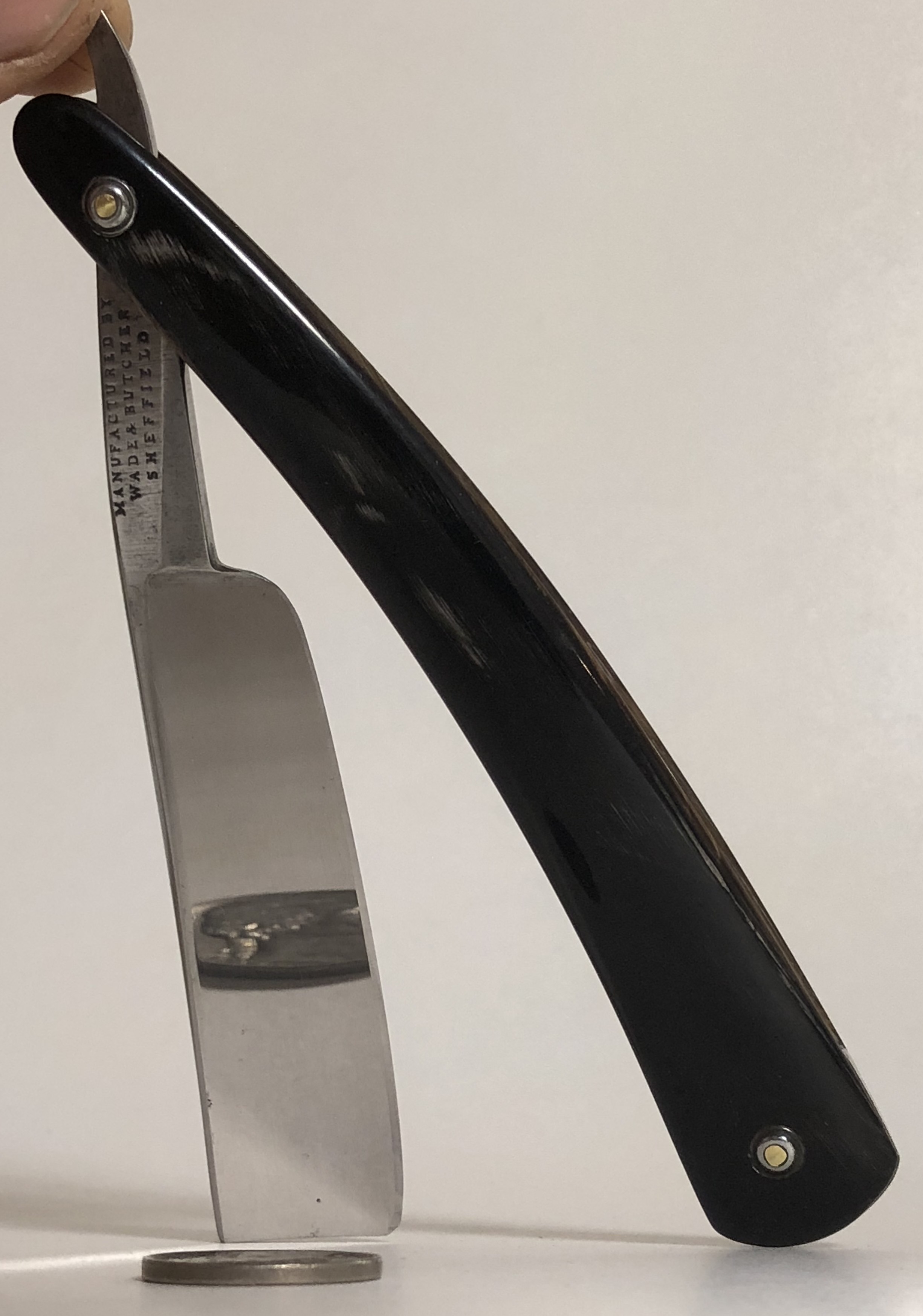 Итак, первый"Мясник" на ваш суд.. WADE&BUTCHER-знаменитый THE SELEBRATED HOLLOY GROUND RAZOR Ширина полотна-23мм или 7/8 Толщина обушка-7 мм Форма лезвия-1/2 клин Углеродистая сталь. Бритва изготовлена до 1891 года, наверно ближе к середине века. Информации по этому легендарному бренду достаточно много, так что можно самостоятельно все найти. Бритва в прекрасном состоянии для своих преклонных лет.Разобрал.Клинок имеет оригинальную ширину.Так как полотно изначально не требовало каких то радикальных работ , в виде регринда и большого снятия металла, то я лишь немного освежил клинок тонким абразивом и все, оставив немного патины, для красоты.Немного больше патины оставил в районе эрля.(все таки не дают мне покоя японские кованые бритвы ручной работы, с коваными и воронеными эрлями). Клинок не имеет рытвин, коррозии или других дефектов металла.Оправа из медового натурального рога, также находится в прекрасном состоянии, без трещин и расслоений.Редкая вещь. Родные пины в комплекте.А куда же без них, чтобы все по фэн шую было?Родная коробочка в удовлетворительном состоянии. Ну тут уж извините.Не каждый картон способен дожить более 150 лет... Тяжелая, брутальная и редкая англичанка будет до конца заточена и доведена до комфортного бритья. Цена-28500 р с доставкой ПРОДАН Spoiler Show