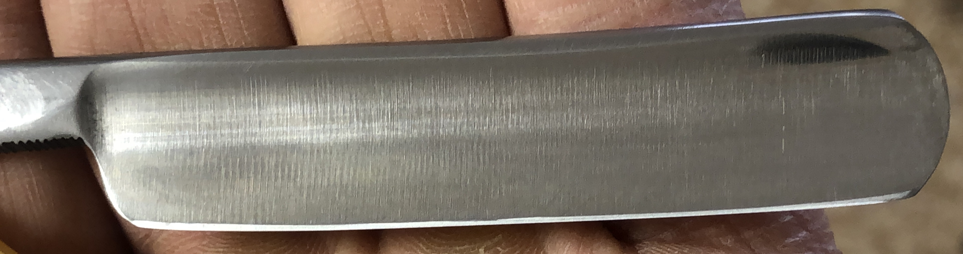 Бритва находится в прекрасном состоянии,практически без следов пользования.Возможно точилась не более одного-двух раз.Клинок без царапин, ржавчины и окисление, имеет оригинальную шлифовку и полировку. Не разбиралась и не ремонтировалась.Идеальная геометрия полотна:кромочка равномерна по всей длине.В общем и целом состояние новой бритвы, без видимых дефектов.За счет своей формы лезвия и толстого обушка,бритва способна брить очень комфортно, кладя ее практически плашмя и не приподнимая обушок при бритье.Качественная, красивая, с прекрасной сталью бритву, на все случаи жизни.