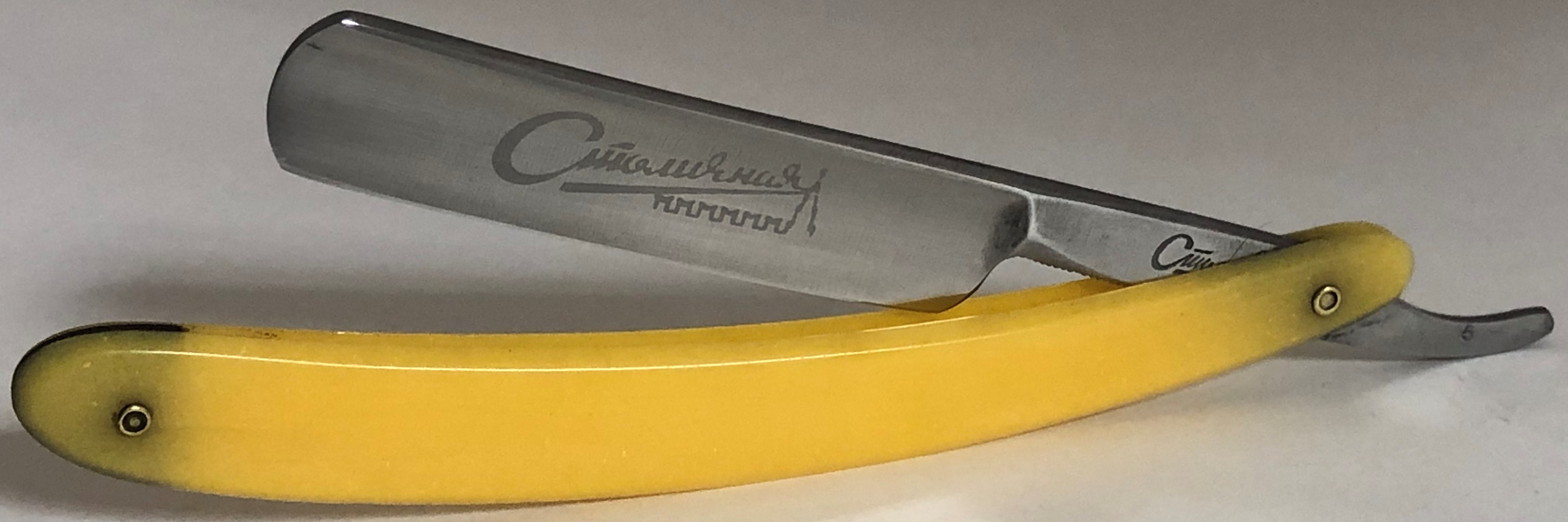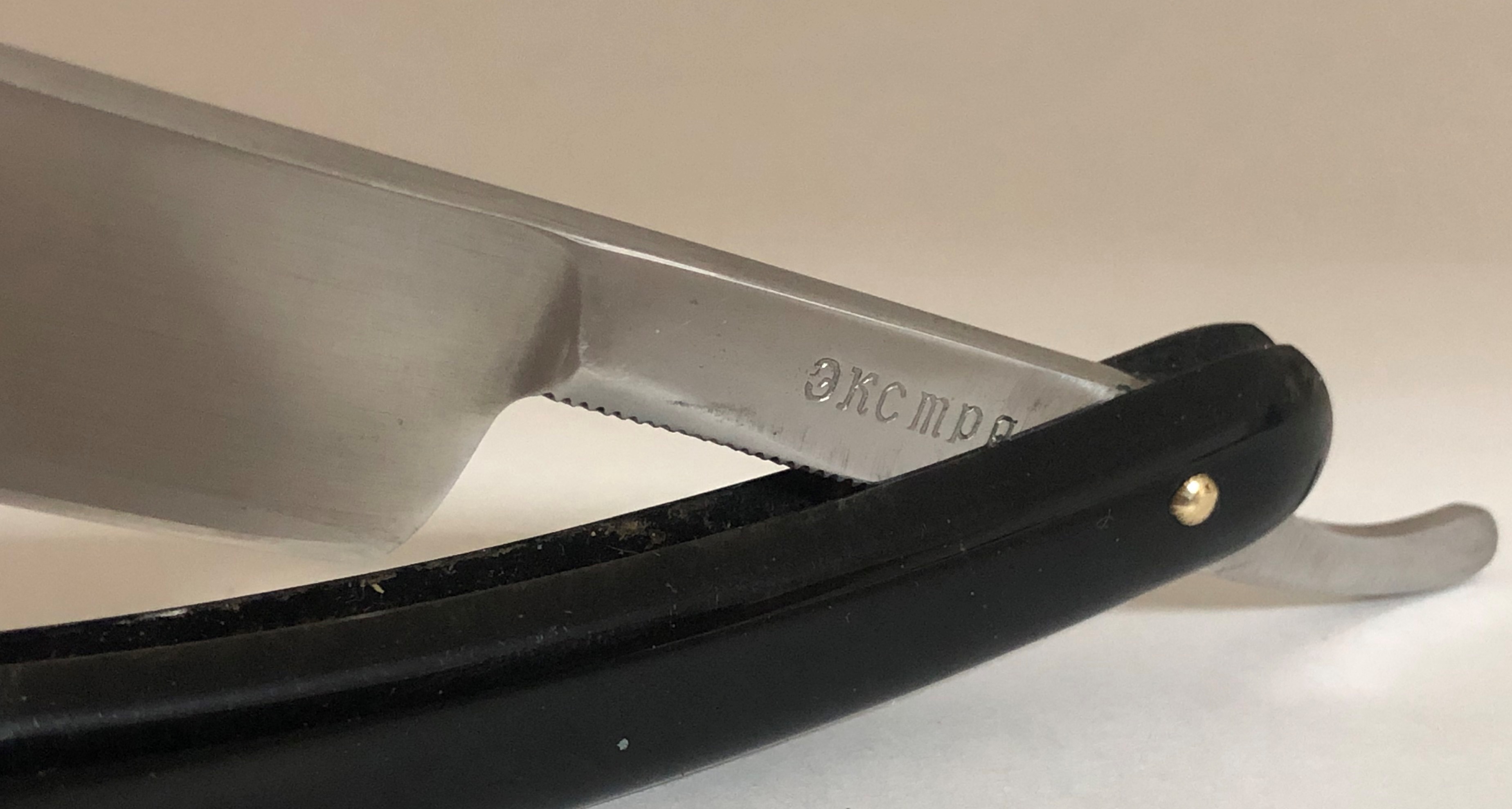 Углеродистая сталь.Про всей видимости 55 это год выпуска бритвы, хотя могу и ошибиться,но не намного.Бритва также без следов пользования.Ничего не разбиралось и не ремонтировалось. Все в оригинале.