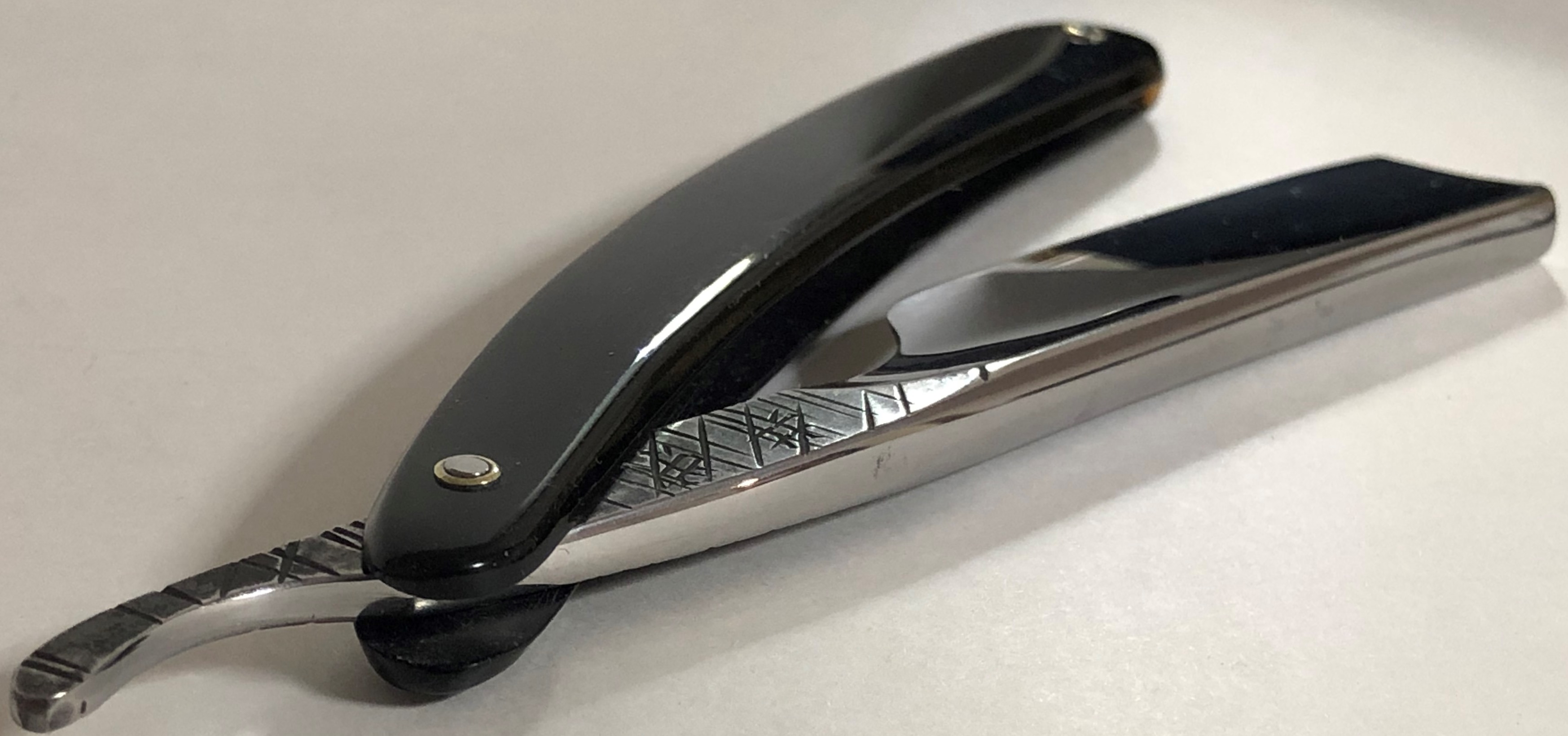 Следов пользования не заметил. Обушок находился в первозданном виде, без следов абразива.Но, пришлось разобрать, немного почистить металл от остатков патины и других дефектов и заново собрать, поставив нормальные втулки, с добавлением внутренних шайб.При шлифовке грани и переходы на "ступеньку" были соблюдены и не зализаны.Если несколько "точек времени" и осталось,но практически незаметны , если смотреть в натуре и не представляют никакого вреда в будущем.Идеальная геометрия клинка:кромочка равномерна по всей длине и еле заметна.Коробочка неоригинальная.Бритва заточена и готова к бритью.