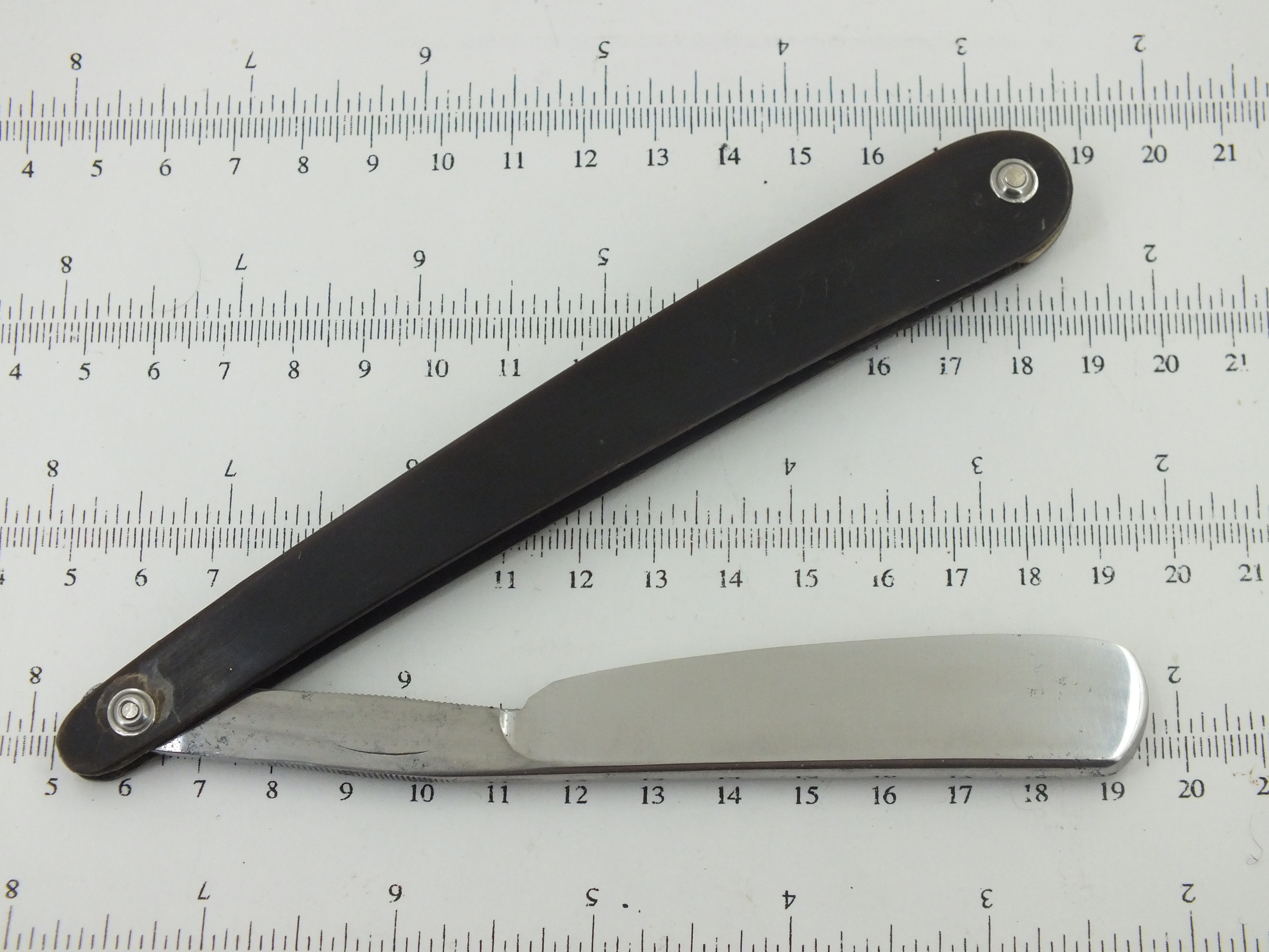 Как оказалось, геометрия отличная - заточил довольно быстро. И пошел бриться. Бритва хорошо бреет, но звук был очень странный, потому что, кроме сильного шуршания, отчетливо слышен неприятный резонанс. При помощи наждачной бумаги P1500 снял оксидацию и все поражения ржавчиной стали видны. В дальнейшем пришлось их шлифовать вручную. Но выяснилось, чем вызван резонанс во время бритья - трещина: Направление трещины указывает, что нужно сделать. Я зашлифовал нос и превратил его в прямым. На следующий день побрился и резонанса уже не было. Только сильное шуршание, потому что выборка бритвы очень крутая: Замерил, 0,09 мм. Вот какие мастера были! С 2013 г. с кайфом бреюсь опасной бритвой пять раз в неделю, в три прохода.