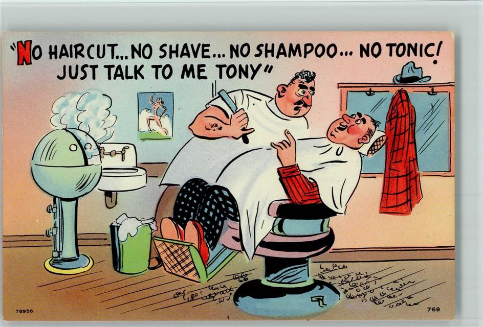 Возьму эстафету на себя, но не буду каждый день выкладывать. Мало кто лайкает, но смотрят - сотни тысяч. Так устроено наше неблагодарное сообщество. 117 тысяч просмотров этой неблагодарной темы. "Ни стрижки... Ни бритья... Ни шампуня... Ни тоника! Просто поговори со мной, Тони." "No haircut... No shave... No shampoo... No tonic! Just talk to me Tony" Открытка (почтовая карточка) 20-х годов 20 века