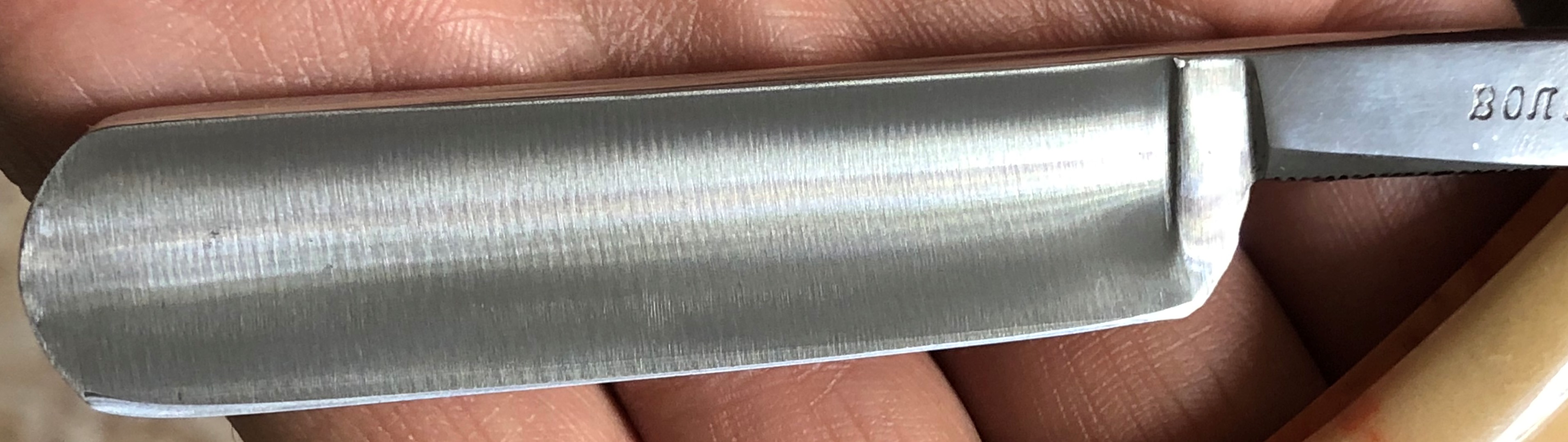 Бритва также в прекрасном состоянии для своих лет. Также была разобрана и приведена в порядок.Был убран небольшой скол в 0,5 мм, поэтому тут полотно немного Уже.По всей видимости эти две бритвы были из одной партии, так как характер нанесения штампа на обратной стороне похожи между собой. Небольшая непроштампованность имеется.Идеальная геометрия.Кромочка равномерна по всей длине.Сталь чистая.Бритва красивая, тяжёлая, с отличной сталью, способную выдавать чистое и мягкое бритье. Проверено лично..Заточена и лично протестирована.Родной коробочки не имеется.