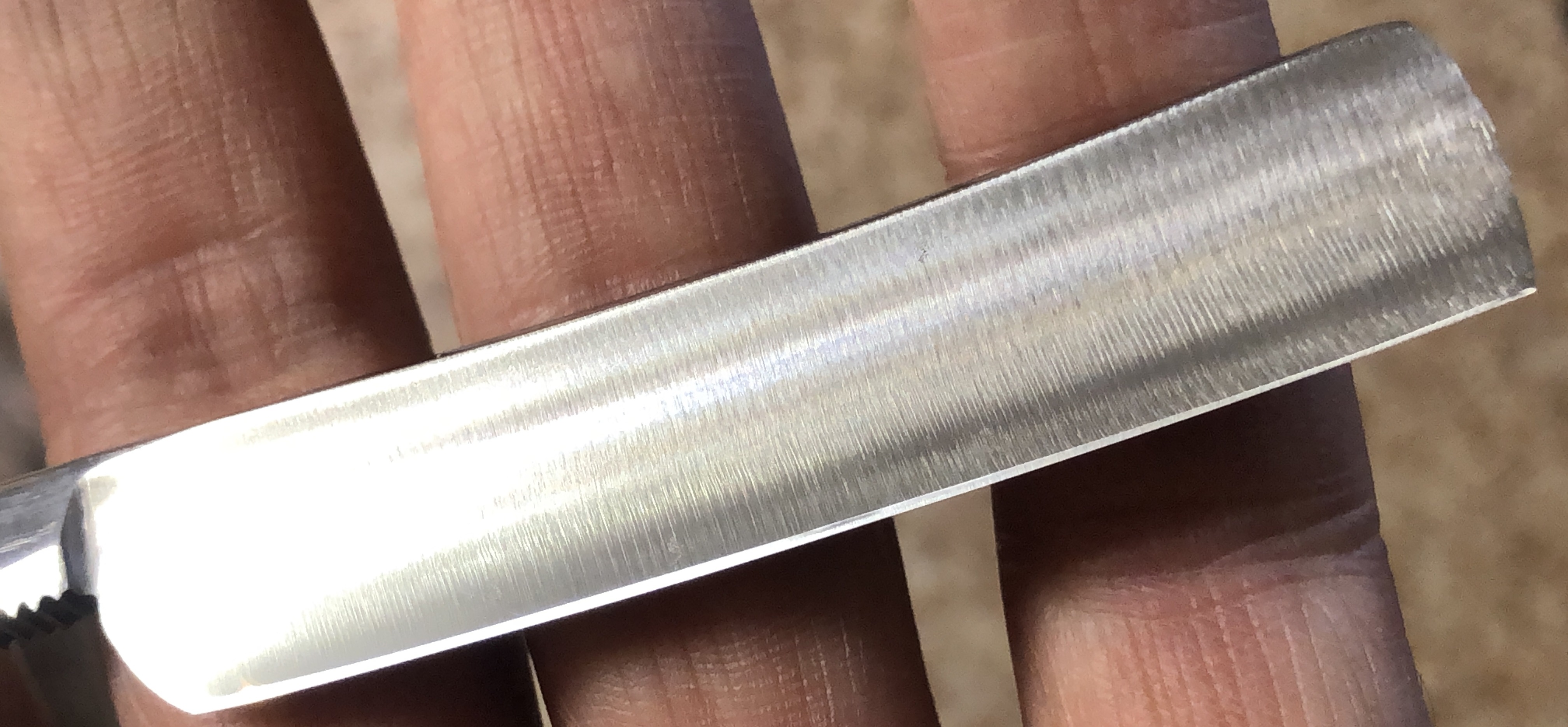 Бритва находится в состоянии приближённому к идеальному.Без следов пользования.Разобрал, немного освежил полотно на самых тонких абразивах и заново собрал. Очень красивая, эффектная оправа будет в самый раз такой бритве.Сталь чистая, без видимых дефектов.