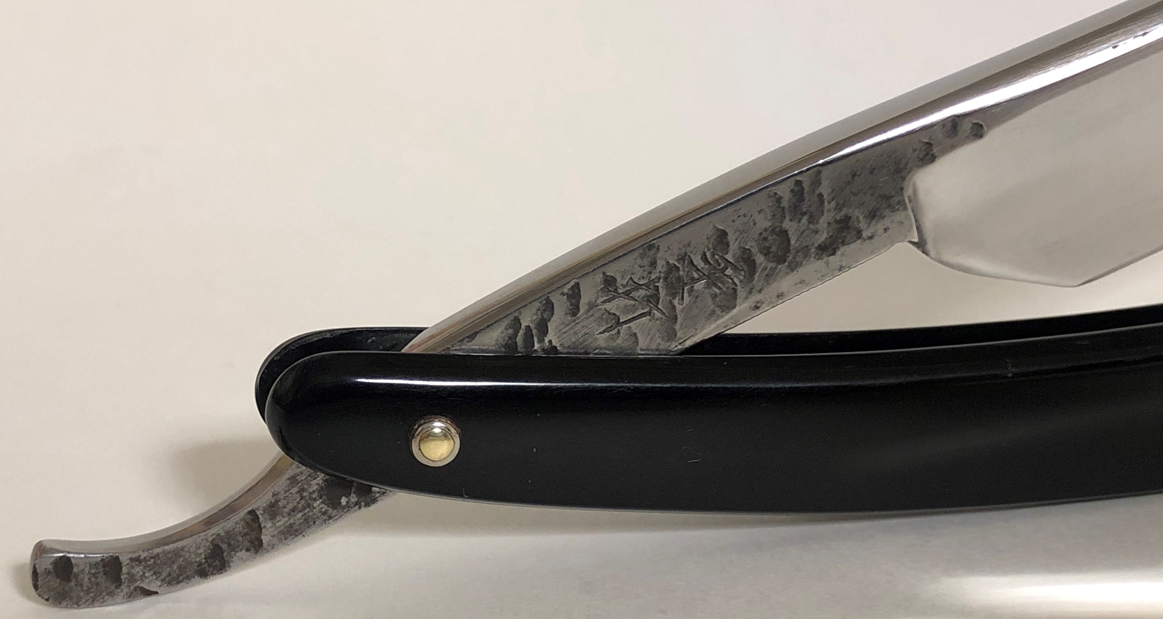 Бритва также в очень хорошем состоянии.Бритва была разобрана,немного почищен и умеренно отполирован клинок.В связи с тем, что бритва долгие годы была в закрытом положении, на полотне образовалось окисление в виде линий, от контакта пластика и металла. Кое что удалось убрать, а остальное оставил, чтобы с этими линиями не снимать лишний металл. Ни на что это не влияет, так что можно не брать во внимание.Сам клинок в очень хорошем и малопользованном состоянии, без активных следов пользования.Гравировка чёткая, без потертостей.Родная оправа целая и ровная. Пины поменял на немецкие втулки и добавил внутренние шайбы.Клин по центру.Идеальная геометрия.Кромочка равномерна по всей длине.Заточена и готова к бритью.