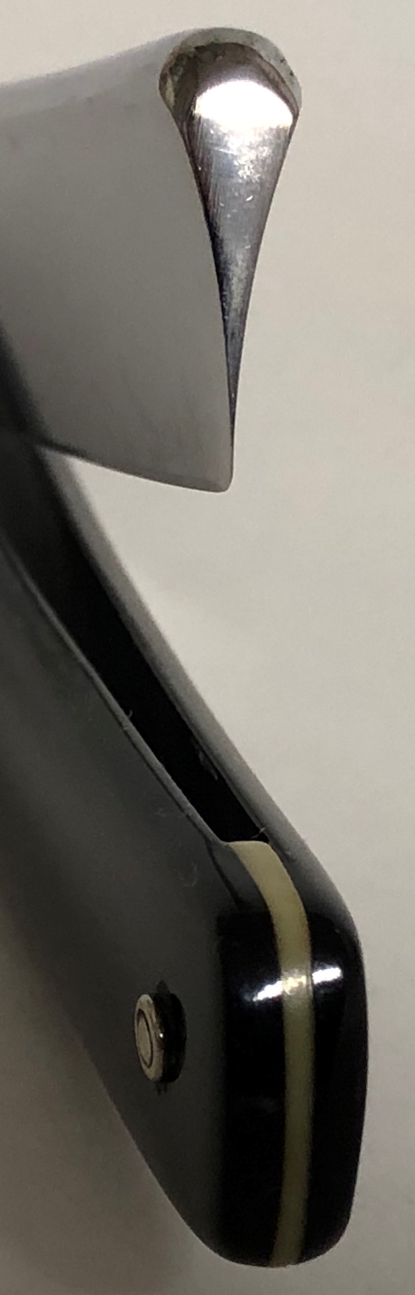 Бритва в идеальном состоянии для своих лет. Следов пользования не замечено. По всей видимости непользованная.Была разобрана, немного почищен район осевого пина, а полотно прошелся самым тонким абразивом, чтобы утрать немного окисления и микро-царапинки.Сталь и кромка чистые. Идеальная геометрия клинка:кромочка равномерна по всей длине и практически незаметна.Пины поменял на японские двух-цветные втулки.Эффектная,фирменная "ступенька жёсткости" на месте,чёткая, без зализанных граней.Очень красивый, укороченный, но в тоже время серьёзный клинок, на все случаи жизни.Заточена и готова к бритью.