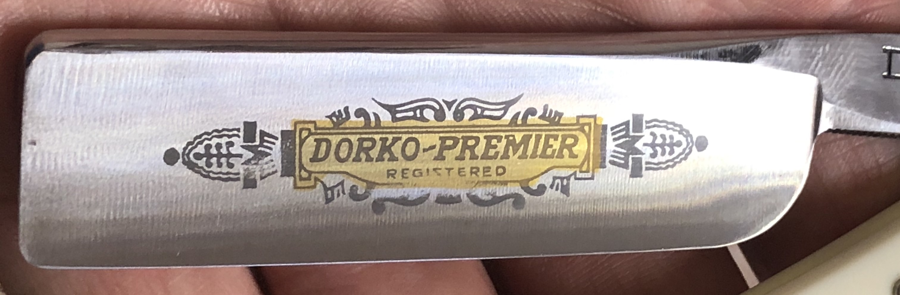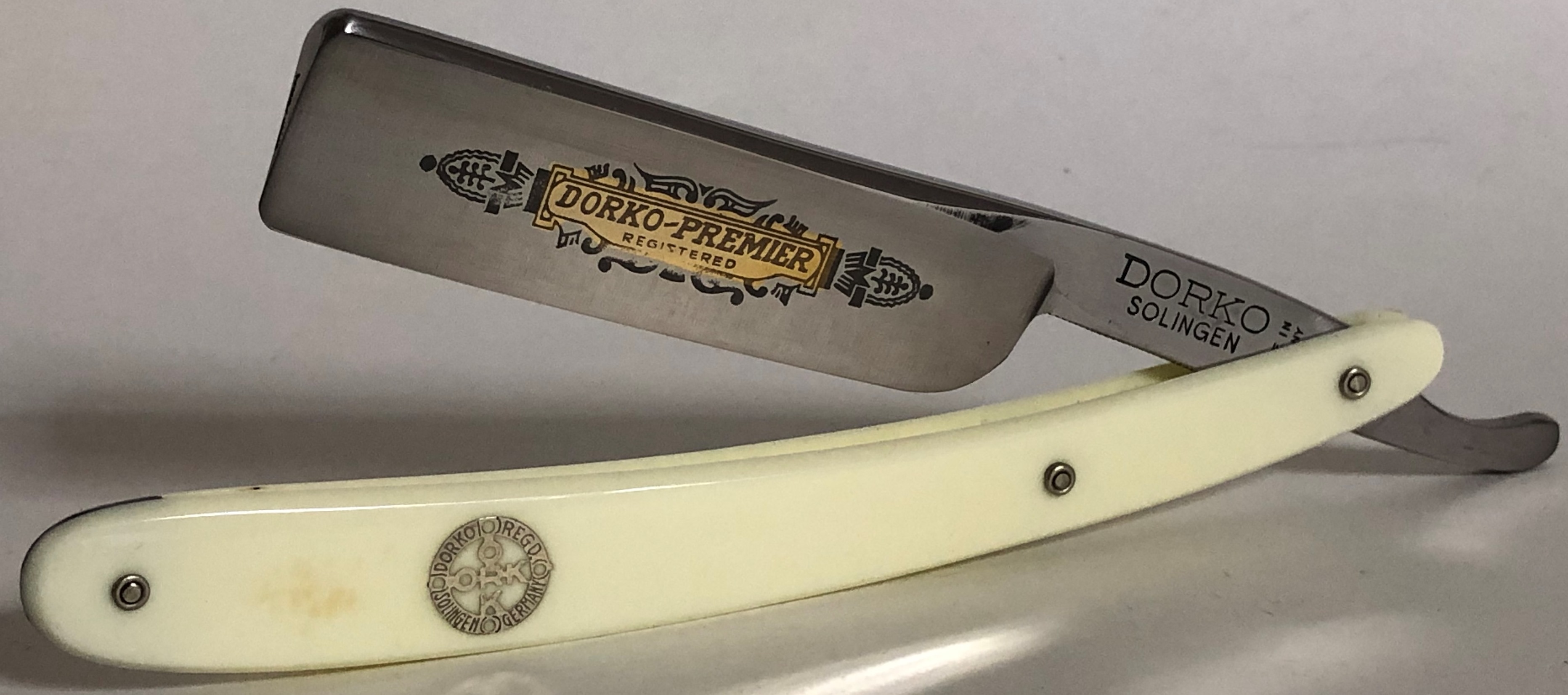 Бритва была разобрана, немного освежено полотно и умеренно отполировано,Пины поменял на немецкие втулки.Идеальная геометрия клинка:кромочка равномерна по всей длине. Сталь не твердая, что по идее должна выдавать достаточно мягкое и комфортное бритьё. Форма лезвия и размер бритвы мог бы очень хорошо подойти новичку.На мой субъективный взгляд, очень красивая бритва, с историей и в прекрасном состоянии. Заточена и готова к бритью.