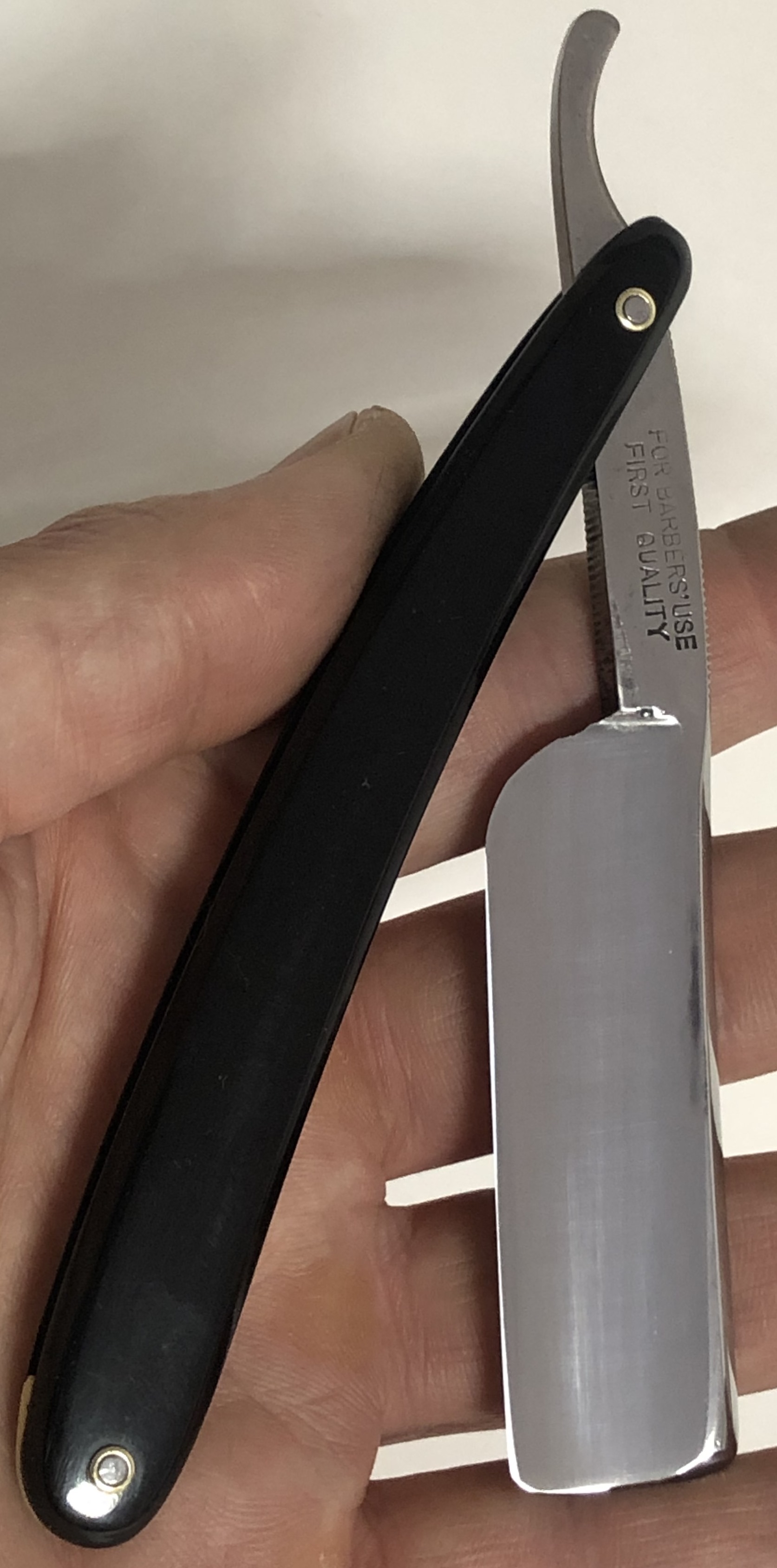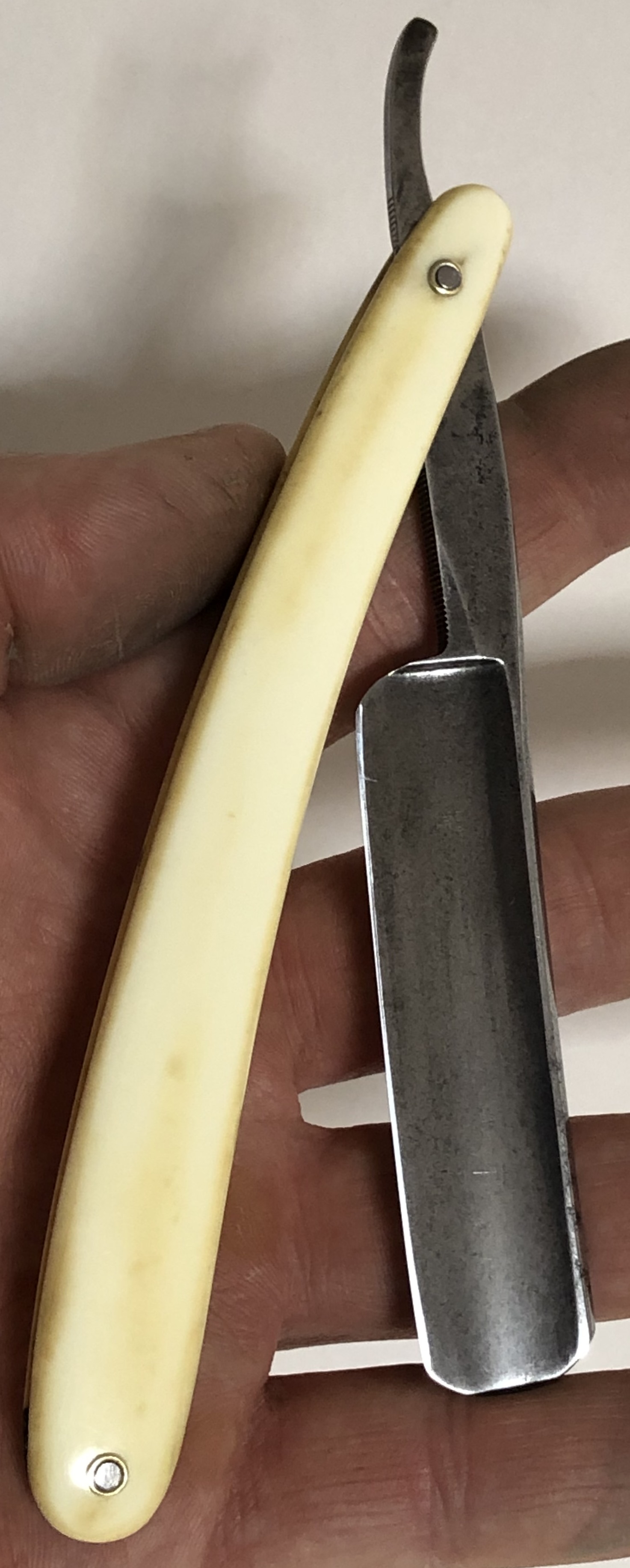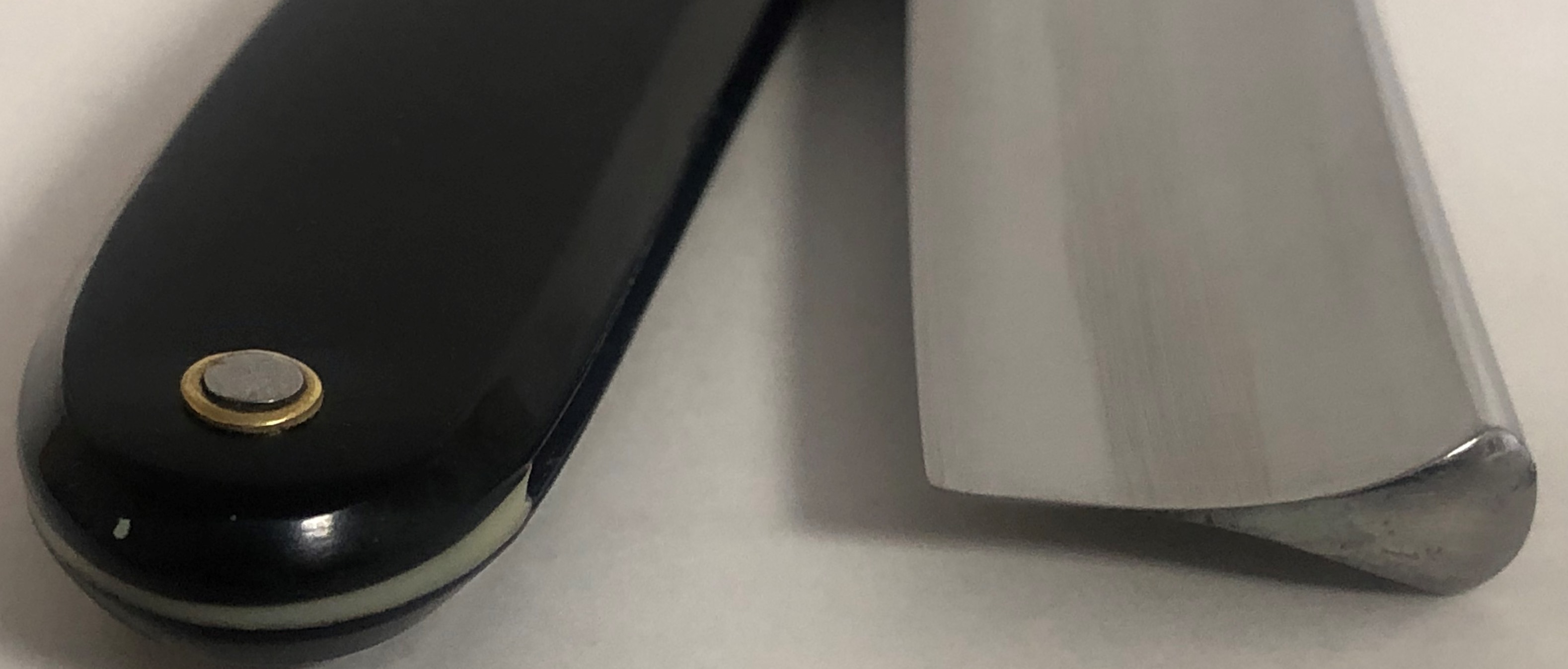 Бритва была разобрана, немного освежено полотно и умеренно отполировано,Пины поменял на немецкие втулки.Идеальная геометрия клинка:кромочка равномерна по всей длине. Сталь не твердая, что по идее должна выдавать достаточно мягкое и комфортное бритьё. Форма лезвия и размер бритвы мог бы очень хорошо подойти новичку.На мой субъективный взгляд, очень красивая бритва, с историей и в прекрасном состоянии. Заточена и готова к бритью.