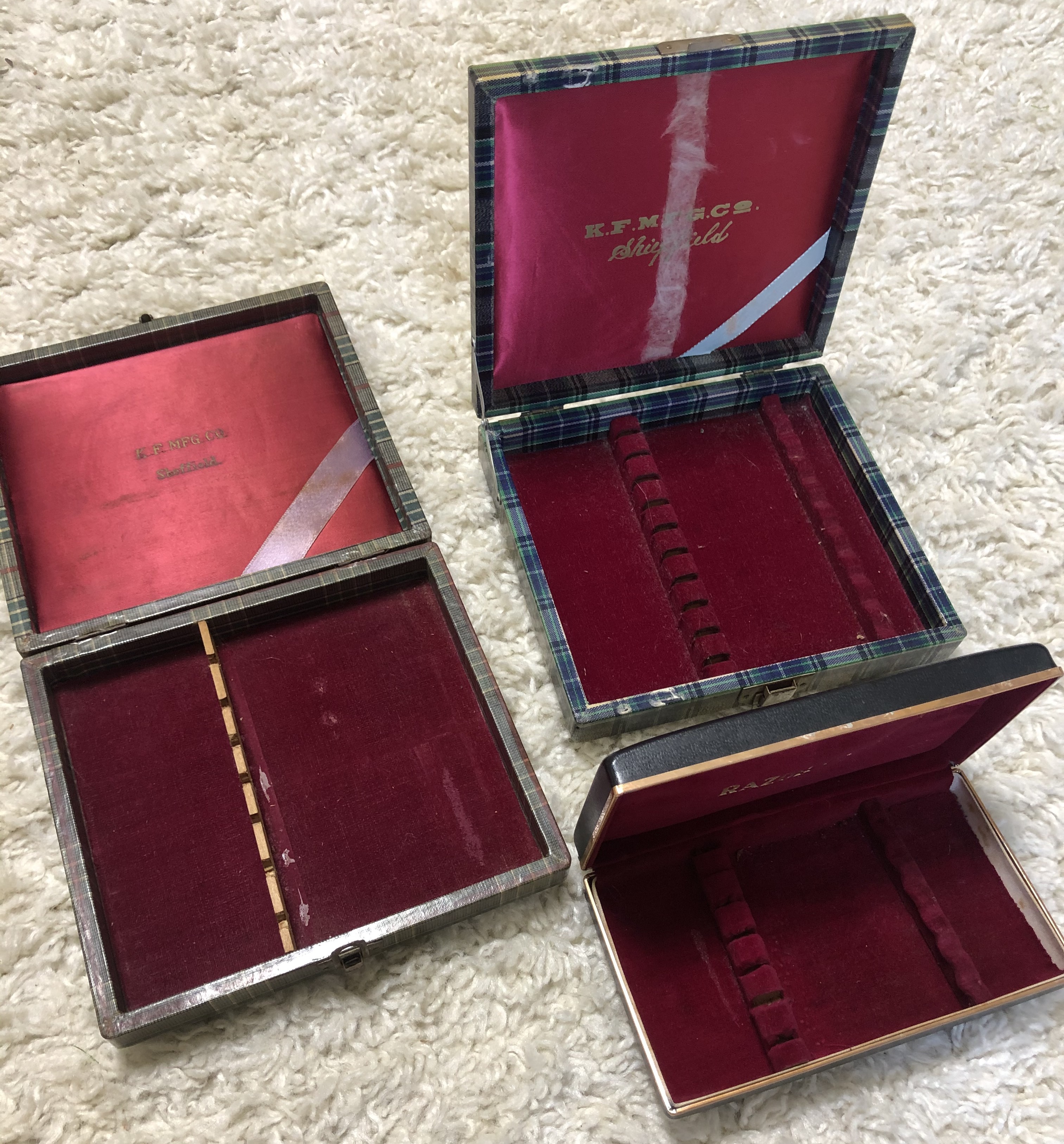 Предложу кучку разных коробок, на 6 и 10 бритв.Как для камисори, так и для евро-бритв. Ну а также, есть комбинированные коробочки камисори-евро.Коробочки хоть и старые, но крепкие..