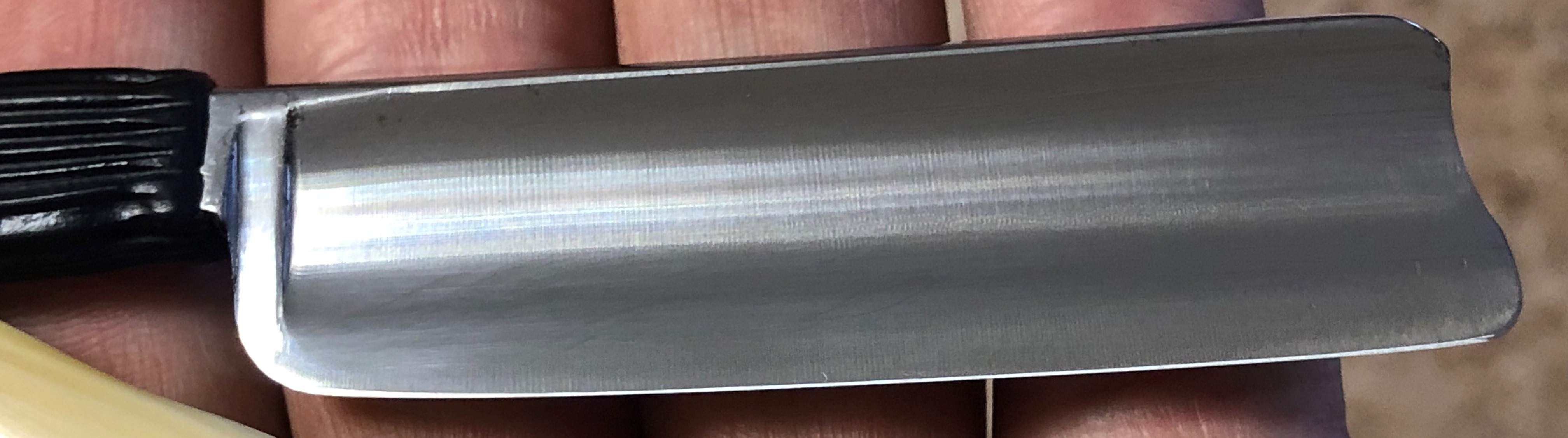 Бритва с немного неестественной формой лезвия именно для японцев."Горбатый"обушок , вкупе с тонким эрлем и средними размерами клинка смотрится очень даже неплохо.Бритву разобрал, почистил полотно и снова обрал, предварительно проклеив трещинку на ручке у нижнего пина.Сталь и кромка чистые от разного рода видимых дефектов.Идеальная геометрия клинка. Кромочка равномерна по всей длине.Удобная, вёрткая, с отличной сталью бюджетная бритва. Заточена и готова к бритью.